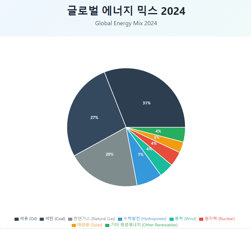 세계의 에너지 믹스를 보면 여전히 석유, 석탄, 천연가스가 큰 비중을 차지한다. 하지만 세계 전력생산에서 재생에너지 비중은 약 30%를 차지하며 꾸준한 성장을 하였다. 성장을 이끈 주역은 태양광과 풍력이다. 전력 ‘믹스’ 관점에서 풍력은 약 4% 안팎으로 아직 미비 하지만, 전 세계 누적 풍력 설비는 1TW(테라와트)를 돌파했고, 그중 해상풍력 누적은 약 83GW로 총 풍력의 약 7%를 차지 하고 있다. 아직 비중은 작지만 해상은 증가 속도가 빠르다.