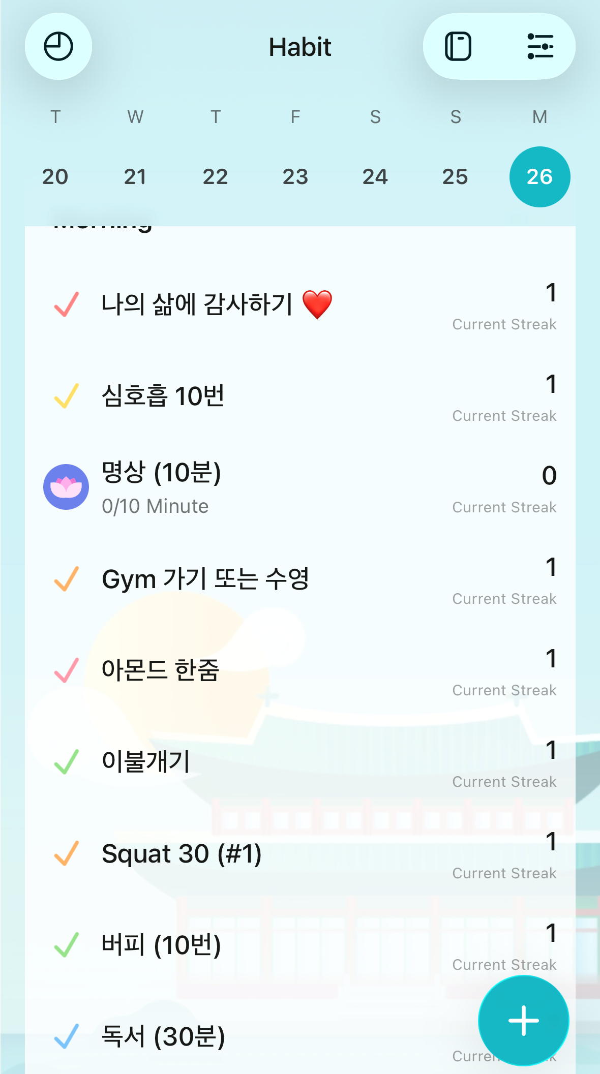 몇 년 동안 A4 용지에 체크하며 기록해보기도 했지만, 결국 스마트폰으로 지속적으로 확인하는 방법이 가장 잘 맞는 듯하다. 내가 예전에 글을 쓴 TickTick 앱을 통해 루틴과 습관을 기록하고 ‘tick’할 때, 아주 작은 성취감과 즐거움을 느낀다. 루틴을 보지 않으면 금세 잊어버리지만, 수도 없이 보고 기록하며 돌이켜볼 때 비로소 내 삶 속에 익숙한 습관으로 자리 잡는다.