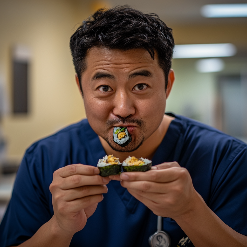 홀로 킴밥을 꺼내 먹었다.