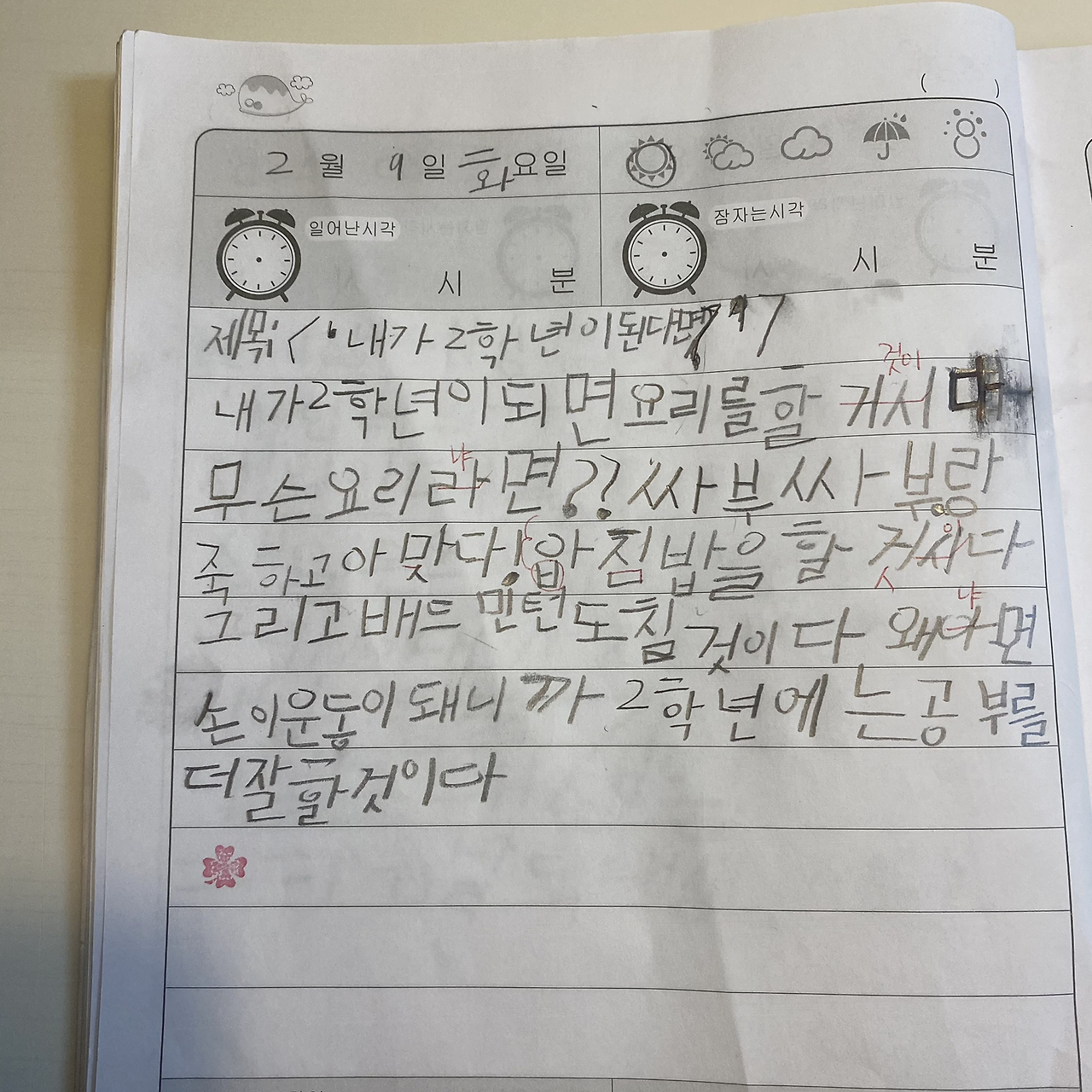 오늘의 글은 학교에서 일기 쓰기로 정한 주제 ‘내가 2학년이 된다면?’이 있어 직접 손으로 쓰기 때문에 다른 주제로 이야기를 말해주지 않고 오늘의 일기장으로 대체한다고 했다. 오후 도교육청 출장을 다녀오면서 그 길로 친정에 들러 우리 엄마가 시어머니와 다인이네 가족에게 전해주는 굴박스를 가져오느라 평소보다 집에 늦게 왔다. 아이들은 아빠와 통화하고 나에게 여러 번 전화를 했는데 폰이 꺼져있어서 자기들끼리 간식을 챙겨 먹고 리모컨을 못 찾아서 어쩔 수 없이 책을 보고 놀고 있었다. 아이들과 함께 차에 싣고 온 굴박스를 각각 현관 앞에 배달해드리고 남편이 포장해 온 김떡튀를 먹으며 지원의 일기장을 열였다. 풋 하고 웃음이 났다. 이렇게 글자 틀린 걸 보면 처음엔 속에 천불이 나고 눈이 뒤집히는 것 같은 기분이 들었는데 언제 또 이런 오타 투성이의 글을 읽을 수 있을까 하면서 위안하는 법도 늘었다. 계속 쓰고 있던 하루북에 아이의 일기를 옮겨 적었다. 분량이 너무 짧아서 추가할 말을 유도하니 이어질 이야기를 술술 불러줬다. 그래도 2학년이 되면 이것저것 도전도 하고 열심히도 한다는 걸 보니 대견하다. ‘2학년에는 공부를 더 잘할 것이다.’ 이 문장에서 나는 꽤나 감동했다. 설레던 내 마음은 아이의 입을 통해 그것이 곧 체육 공부라는 사실을 알게 되면서... 묻지 않을걸 하고 약간 후회도 했다. 그래도 아무튼 아들, 뭐든 열심히 하는 2학년이 되렴.