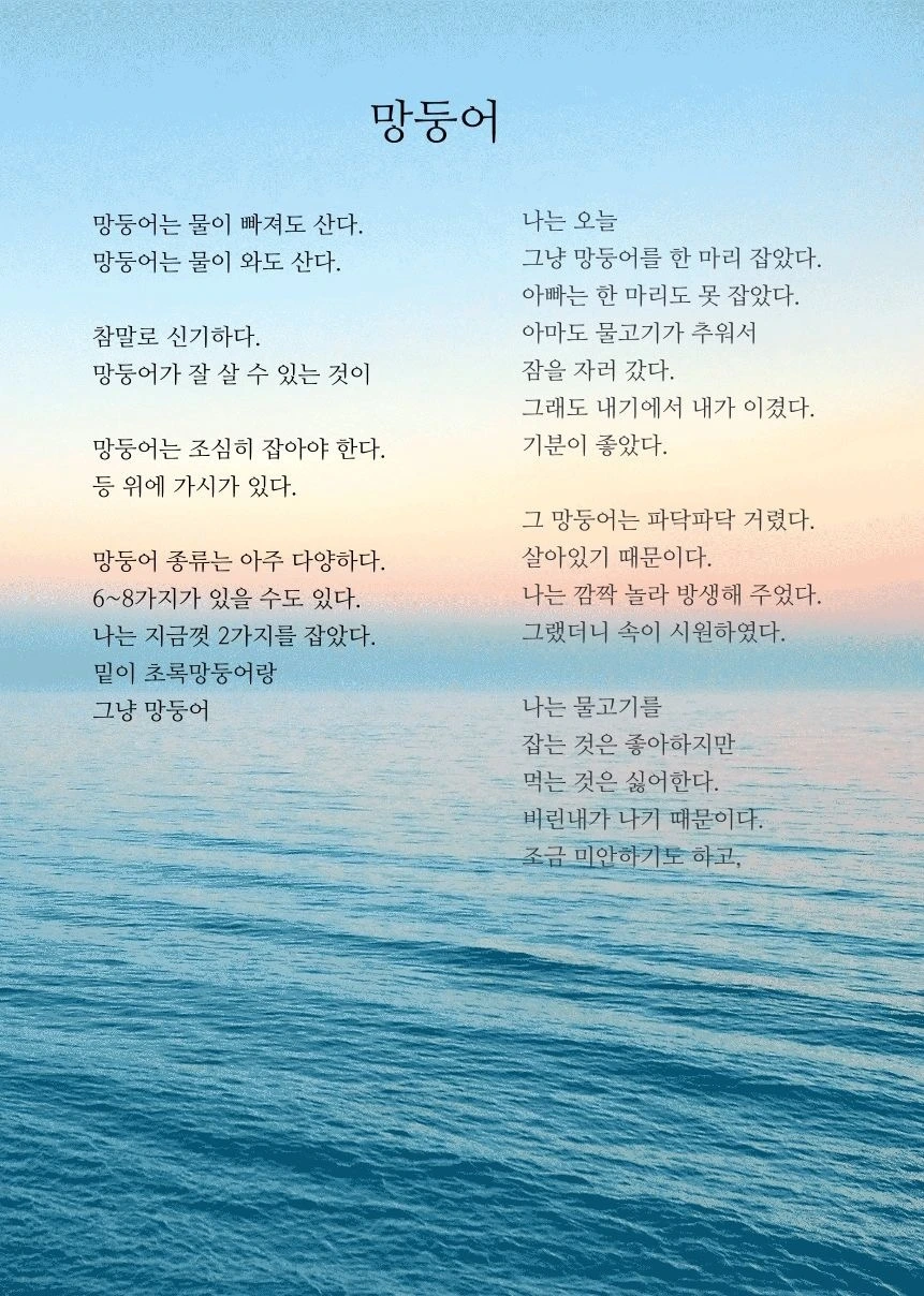 지난밤 아이가 쓴 글은 ‘망둥어’이다. 이 글이 탄생한 데에는 또 하나의 비하인드 스토리가 있다. 본 명절 하루 전 아이는 지금껏 계속 외갓집에 가서 외할머니 이모와 함께 명절 음식을 만들었다. 어느 정도 크고 난 후 전 뒤집기를 시켜줬으니 한 3~4년 정도 되었다. 요리사가 되고 싶은 아이에게 마음껏 다양한 요리 과정을 보고 살짝 참여도 할 수 있는 시간, 그것도 세상에서 제일 좋아하는 이모랑 비비적거릴 수 있고, 방방 뛰어도 되는 할머니집. 그런데 코로나 때문에 결혼식은 없었지만 가족이 더 늘었다. 동생이 결혼 준비를 위해(집 문제) 얼마 전 먼저 혼인신고를 한 것이다. 연애 11년 차이기 때문에 늘 우리와 함께 있는 룡이도 익숙했지만 이젠 제부라고 불러야 하나? 아무튼, 5인 이상 집합 금지 때문에 아이에게 오늘 가면 안될 것 같다고 했더니 인상이 구겨지기 시작했다. 차선으로 혼인신고를 마친 여동생과 제부를 시댁에 먼저 가서 인사하고 오라고 이르자 아이가 울상이 되었다. 그렇게 이모가 가면 가서 요리를 하면 된다고 했는데 아이가 외갓집에 가고 싶은 이유는 재밌는 요리 때문이 아니라 이모와 같이 요리할 수 있기 때문이었다. 이모가 결혼하면...이라는 상황을 인지시켜주니 곧 울 것처럼 되었다. 그때부터 아이가 뿔이 나기 시작했다. 사춘기 소년으로 돌변한 듯 말수가 없고 무기력해지기 시작했다.