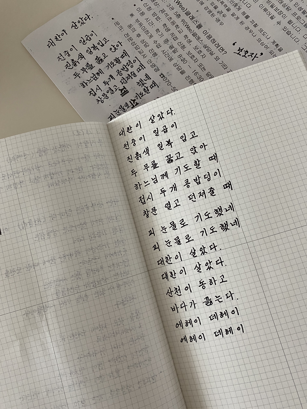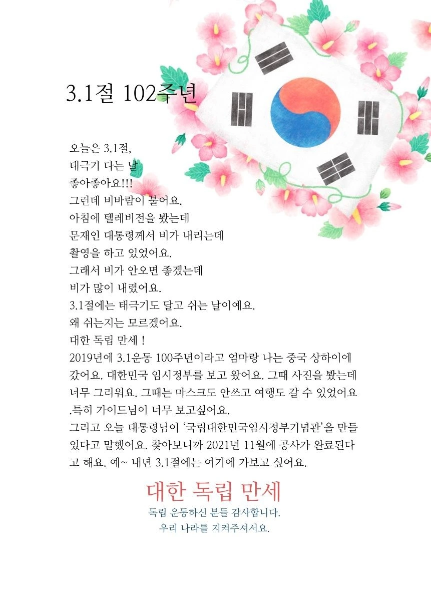 가족이라는 것은 어떤 공통의 관심사를 공유하고 나누며 성장할 수 있는 감사한 존재이다. 나는 가끔 잔소리 마왕으로 군림하다가도 이 아이들이 성큼 자라 내게 가르침을 주고 동기 부여가 되고 해서 내가 가끔 아이들에게 배울 때가 있어 친구같은 감정을 느낀다. 어떤 감정과 생각을 느끼는지 온전히 알 수 없었던 웃고 울고 떼쓰고 하던 시기에서 이렇게 또록하게 감정을 드러내 말하는 어린이가 되어서 가끔은 골치가 아프고 말로 질 때도 있지만 이렇게 그 감정을 받아쓰는 과정은 아이를 공부하는 시간이다. 대한이 살아서 산천이 동하고 바다가 끓는다는 표현이 과연 어떤 것인지 알기까지 아직 많은 날들이 필요하겠지만 역사에 대한 호기심이 가득한 아이로 자라나고 있어 엄마는 오늘도 감사하다.