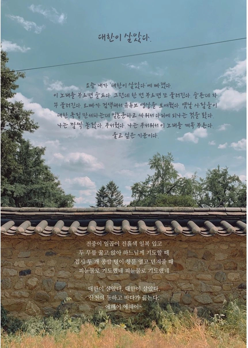 지난 3월 1일, 102주년 3.1절 기념행사를 TV 생중계로 같이 보던 날에 우리는 가수 정인과 래퍼 매드크라운의 ‘대한이 살았다’ 공연을 보았다. 그날은 아직 쌀쌀한 기운이 가득했고 비가 많이 내렸다. 코로나 상황으로 인한 탑골공원에서 기획된 야외무대로 최소한의 참석자로 진행되었기에 이 행사를 진행하는 사람들과 무대에 오른 가수가 얼마나 악조건의 상황에 있었는지는 나는 따뜻한 우리 집 소파에 앉아 보고 있었지만 그들의 힘겨움이 그냥 절로 느껴졌다. 아무튼 그들이 그 빗 속에서 혼신의 힘을 다해 부른 노래는 바로 ‘대한이 살았다’였다. 그 노래는 예전에도 몇 번 들어보기도 해서 그런지 아이가 쉽게 따라 불렀다.
