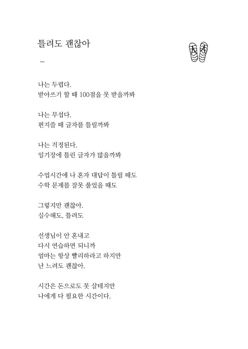 아이의 글을 보며 아이의 생각이 자라고 있음을 배운다. 나는 좋은 엄마이고 싶은데 글 속에 등장하는 엄마는 늘 잔소리꾼이거나 재촉을 하는 사람이다. 아이는 어디선가 주워 들은 멋진 말을 잘 기억해뒀다가 적절히 써 먹는 때가 늘었다. 틀려도 괜찮다는 생각은 왜 하게 된 것일까? 내가 평소 무엇을 틀렸다하여 혼내거나 핀잔을 주지는 않았는데 아이는 스스로 그것을 무서워하고 두려워하고 있었다. 아마 더 잘하고 싶은 욕심이 있어서 그런 것이겠지? 틀려도 괜찮다고 스스로를 다독이는 글을 쓸 수 있게 되다니 이제는 누군가를 스스로를 위로할 수 있는 힘을 얻은 것은 아닐까? 궁금해서 오늘의 글을 쓰면서 옆에 있는 작가님에게 물었다.