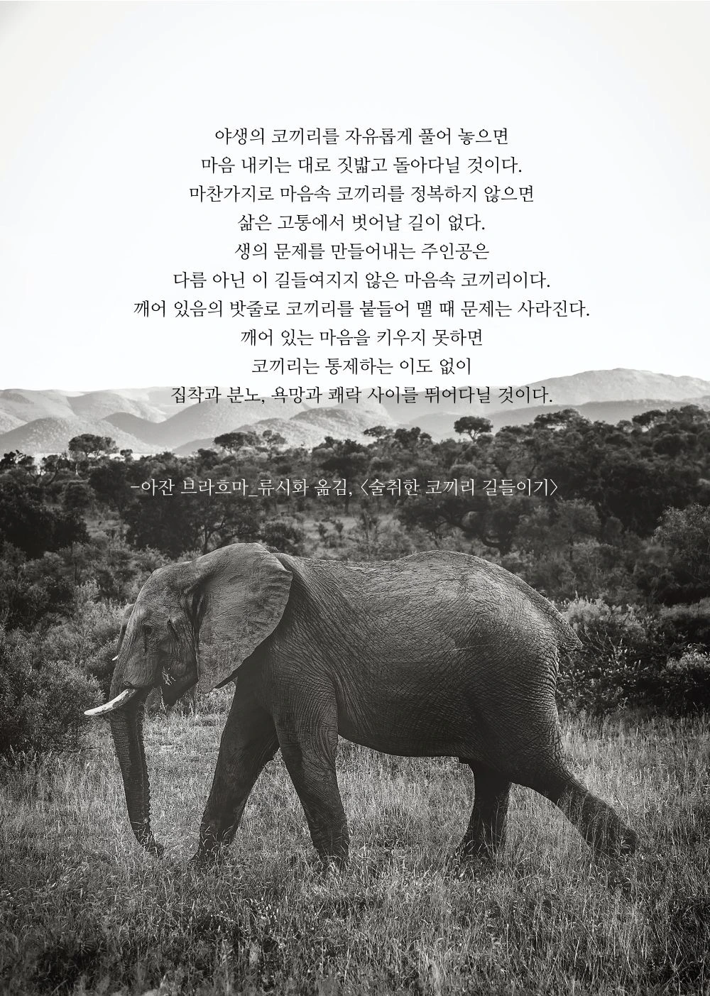 한 여름의 꿈처럼 다녀간 친구가 내게 마법 같은 책 한 권을 주고 떠났다. 아잔 브라흐마가 쓴 『술 취한 코끼리 길들이기』였다. 나는 그 책을 한 장 한 장 아껴 읽으며 폭풍 같은 시간을 견뎠다. 핸드폰 배경 화면과 카카오톡 프로필에 흑백의 코끼리 한 마리로 바꾸고 매일같이 녀석을 들여다보았다. 매일같이 코끼리를 생각했다. 그 코끼리는 가끔 술을 마실 때도 있고, 금주를 할 때도 있고, 폭음을 할 때도 있다. 하지만 그것은 중요하지 않았다. 코끼리를 길들이는 법을 찾아 틈이 날 때마다 그 책을 읽고 또 읽고, 쓴 곳을 닦고, 닦은 곳을 더 닦으며 나는 견딜 수 있었다.