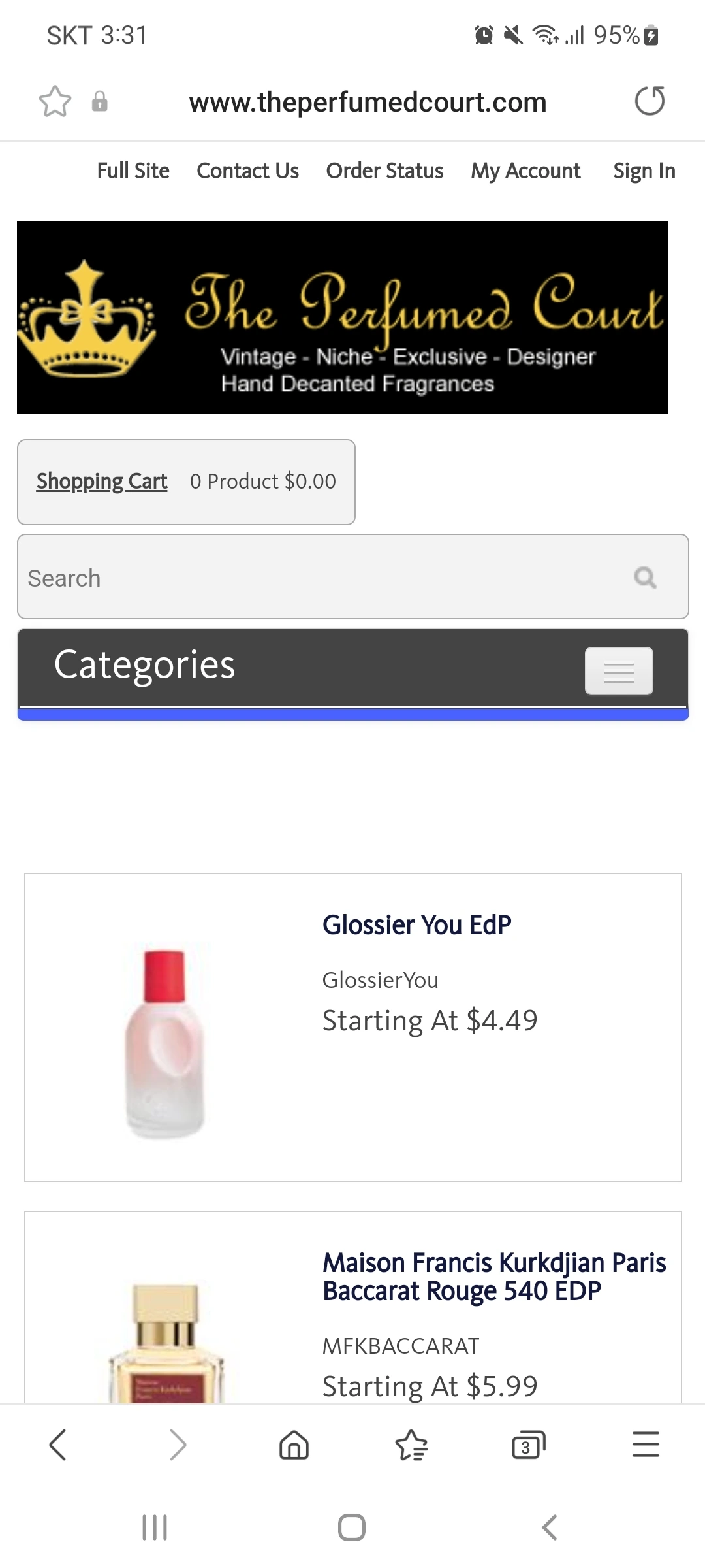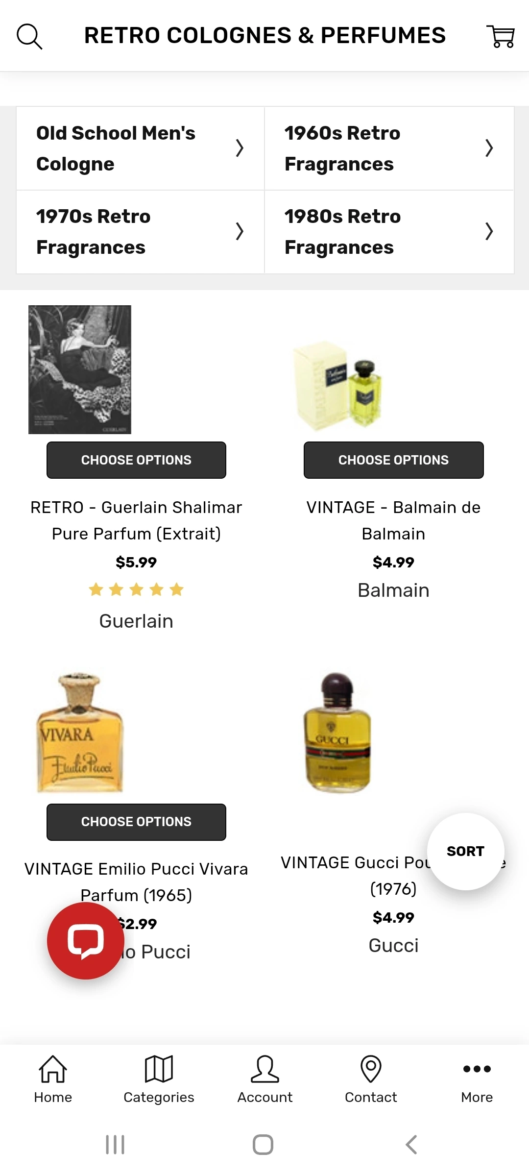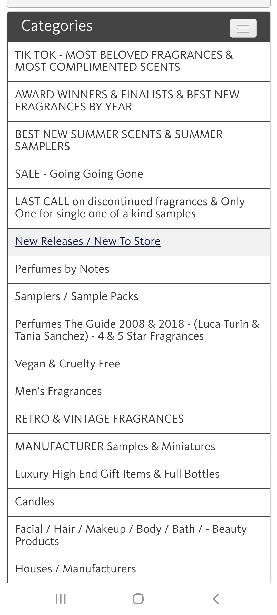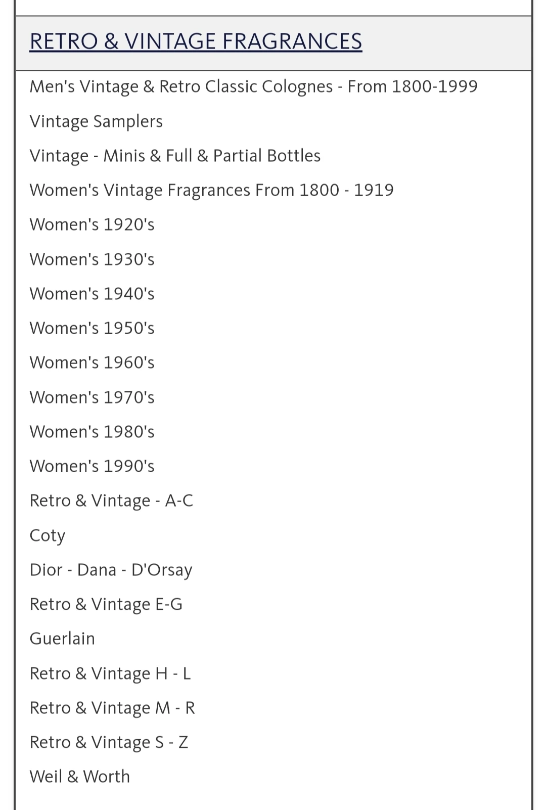 개인적으로 이 사이트를 좋아하는데, 비교적 희귀한 향수를 많이 가지고 있기 때문이다. 가입해서 로그인하고 둘러보다 보면 카테고리란에 레트로&빈티지 향수라고 따로 항목이 개설되어 있는 것을 볼 수 있다. 클릭해서 보면 남성용으로 나온 향수, 여성용으로 나온 향수 몇년대, 이런 식으로 세부화되어 있다. 저기에서 sampler 라는 단어를 볼 수 있는데, 이것은 한 테마 (향조, 시대, 저명한 향수 블로그에서 추천한 빈티지 향수들, 기타 등등)을 잡아 샘플들을 묶어 파는 것이다. Mini&full&partial bottles 는, 미니어쳐 향수(보통 2ml~7.5ml 정도를 미니어쳐라고 부른다. 예전에는 향수를 홍보하기 위해 이런 작은 향수병을 나눠주곤 했다), 본품, 그리고 중고물품 중 어느 정도 사용감이 있어 50%만 차 있다던가 이런 병을 파는 것이다. 이 외에도 Retro&vintage A-C 이런 것을 볼 수 있는데, 이것은 향수 브랜드별로 이름이 A-C로 시작하는 브랜드, E-G로 시작하는 브랜드 이런 것을 모아둔 것이다.