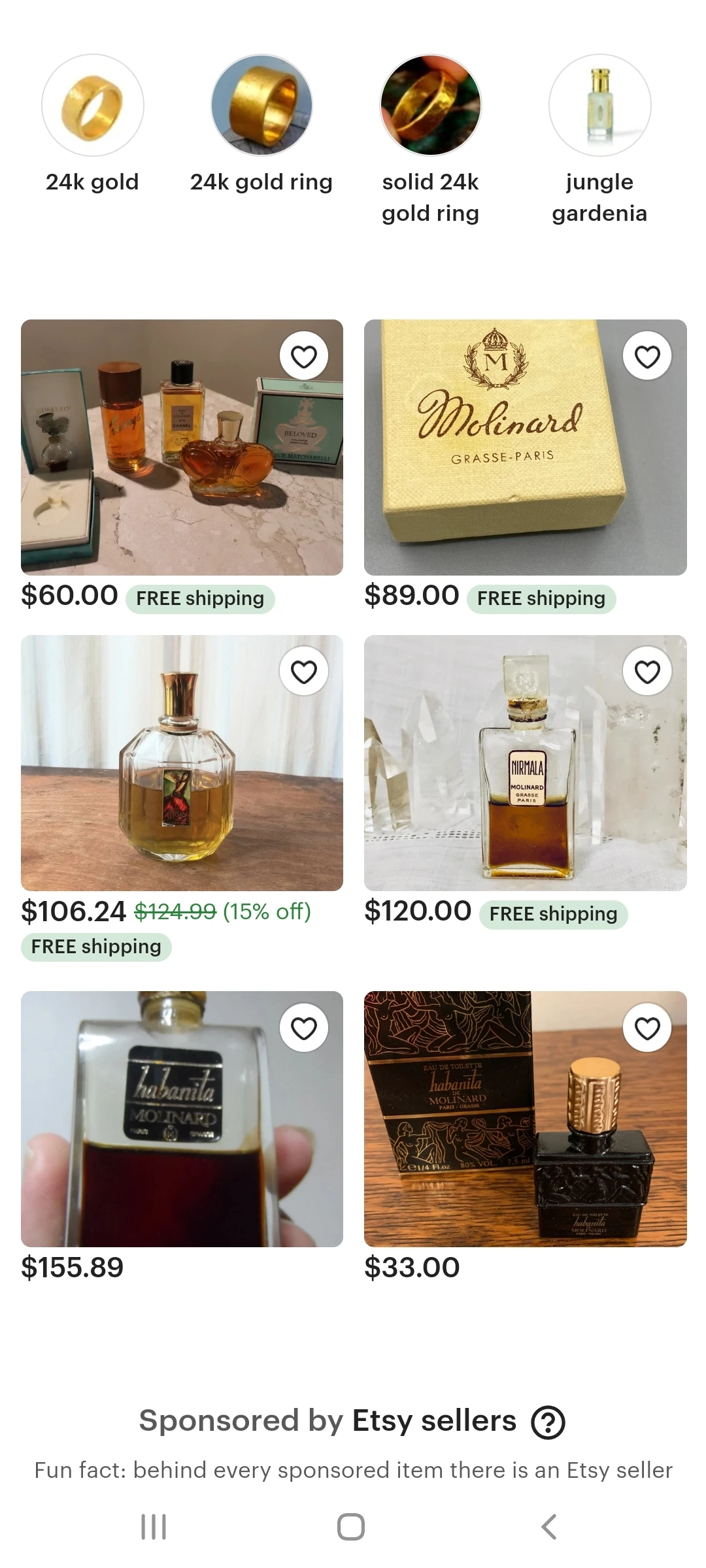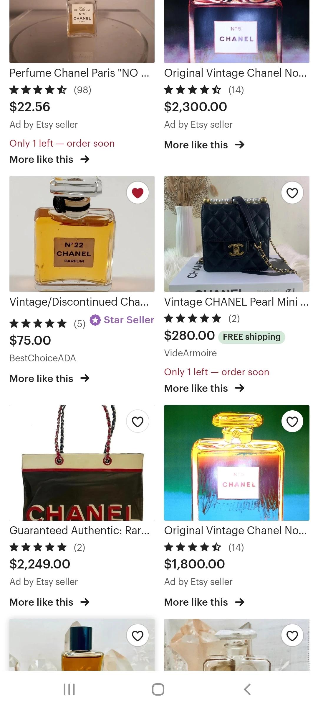 Etsy는 초보자에게 권하기 어렵다. 일단 검색을 했을 때 오른쪽 사진을 보면 샤넬 No.5를 쳤는데 관련 없는 샤넬 No.22나 다른 것들이 나오는 것을 볼 수 있는데, 이렇게 보듯이 내가 찾는 것과는 다른 물건이 나오기도 하고, 중간에 Ad by Etsy seller 라고 적혀있는 물건들이 나오기도 하는데 이것은 내 검색어와 조금이라도 연관이 있는 것들을 엣시에서 광고용으로 보여주는 것이다. 그러나 여기에도 빈티지 향수를 판매하는 사람이 많으므로 아예 쓰지 말라고 하기는 어렵다. 가운데 사진은 내가 계정 로그인을 했을 때의 페이지인데, 내가 최근에 검색해봤던 것들이 상단에 동그라미 모형으로 뜨고, 그리고 봤던 물품들이 밑에 사진으로 뜨기 때문에 내가 최근에 뭘 봤었지? 하고 헷갈리는 경우에 유용하다.