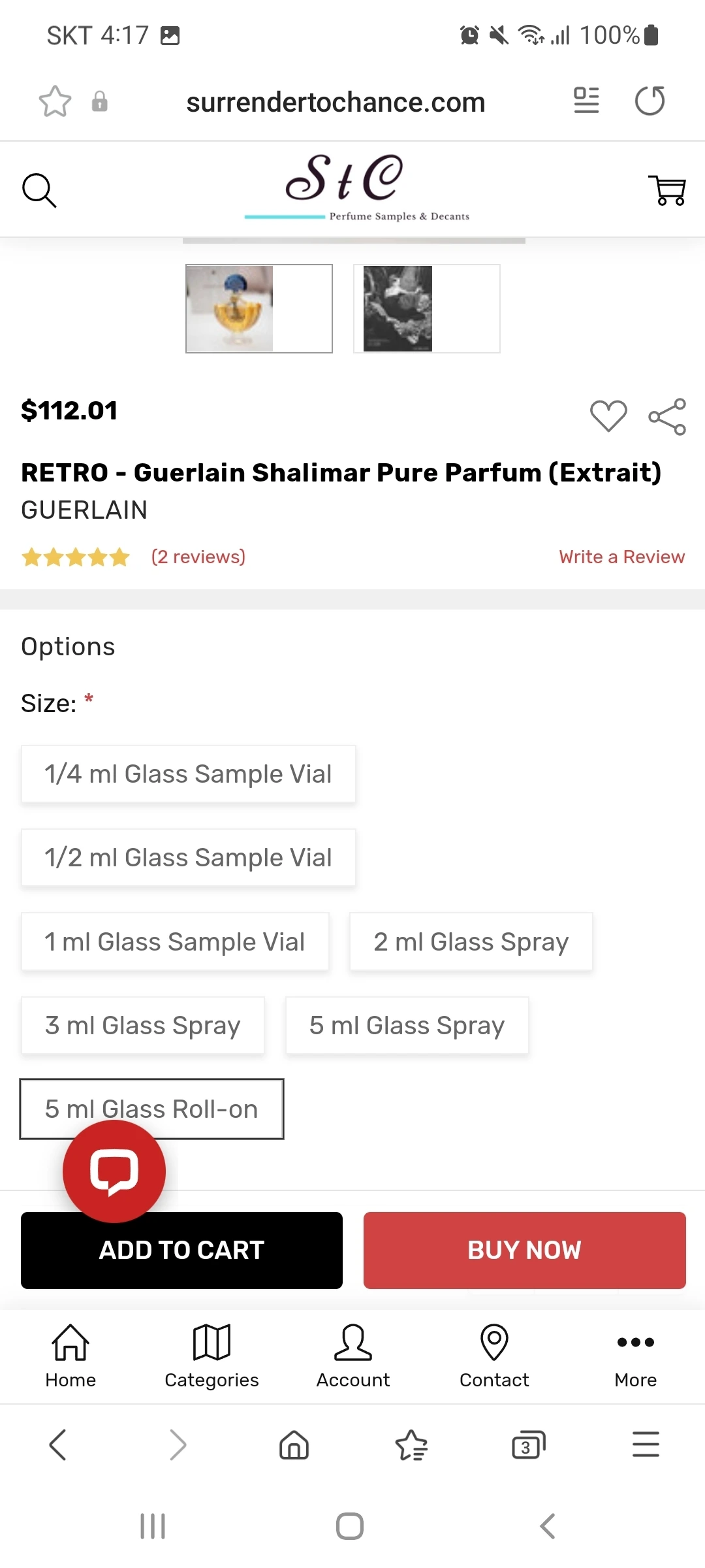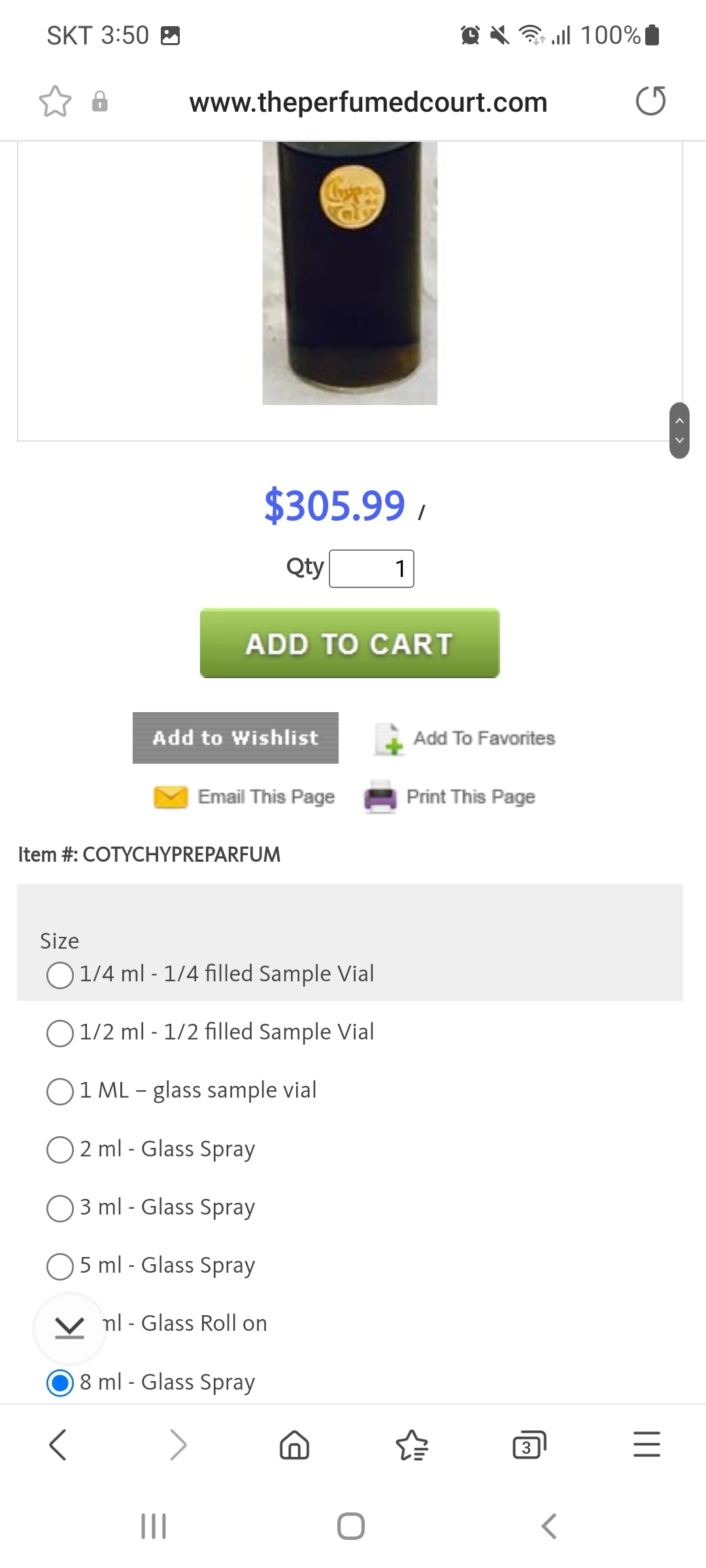 보시다시피 0.25ml의 경우 10.99달러지만, 8ml를 골랐을 경우 305.99달러가 된다. 빈티지 코티 시프레가 궁금하기만 한 사람이면, 0.25ml 정도를 사서, 한번 시향해보고 아! 이런 느낌이었구나 하는 것도 나쁠 것은 없다. Glass spray와 glass roll on 의 차이가 있는데, 전자는 스프레이형 소분병에 온다면, 후자는 롤온, 즉 피부에 직접 닿아 바르는 형태로 오는 것이다. 그렇다고 롤온이 고체형이라는 것은 아니다. 병 입구에 구슬이 있어, 구슬을 피부에 접촉시켜 굴리면 향수가 피부에 발라지는 것이다. 개인적으로 롤온은 피부에 너무 자주 닿아 오염이 될 수 있어 좋아하지 않지만, 오히려 선호하시는 분들도 있기 때문에 이것은 사람마다 취향 차이인 것 같다.