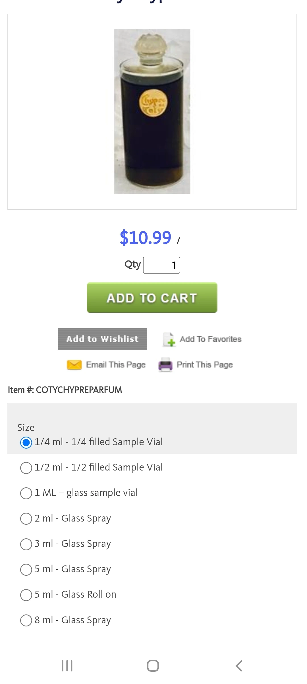 왼쪽 사진을 보면 starting at 이라는 단어를 볼 수 있는데, 이것은 가장 작은 사이즈-보통 0.25ml 아니면 0.5ml-가 그 가격이란 뜻이고, 샘플 사이즈가 커질수록 값이 올라간다. 예로 코티 란으로 들어가서 코티 시프레를 보자.