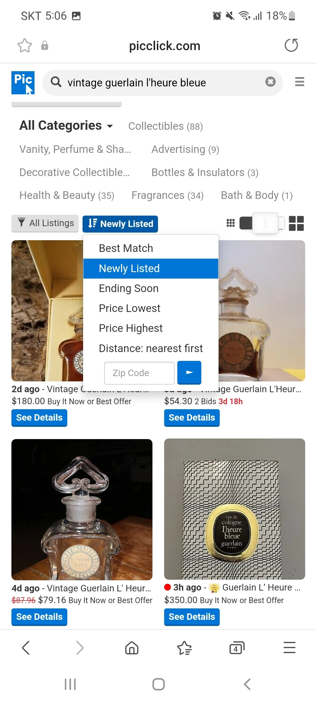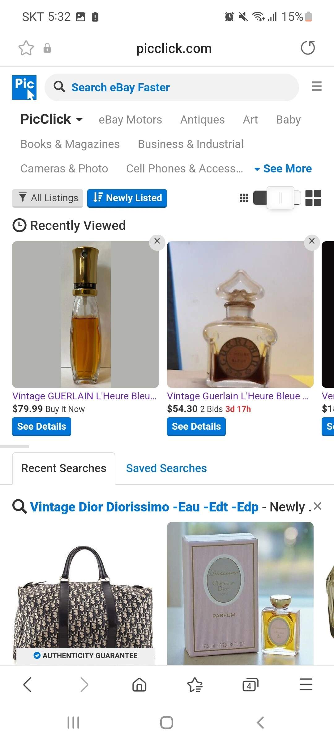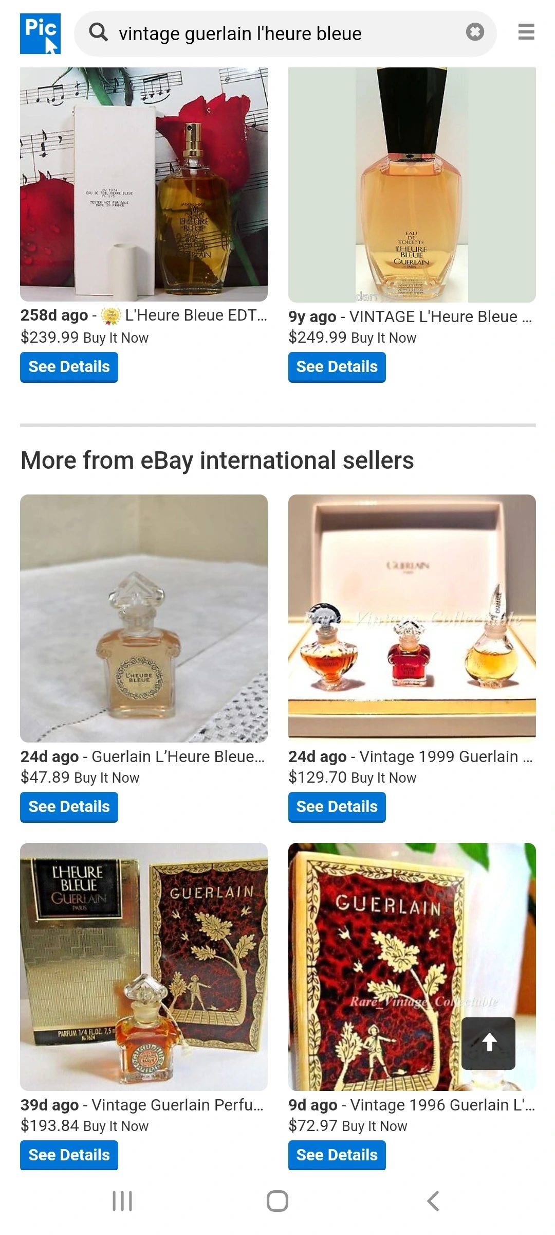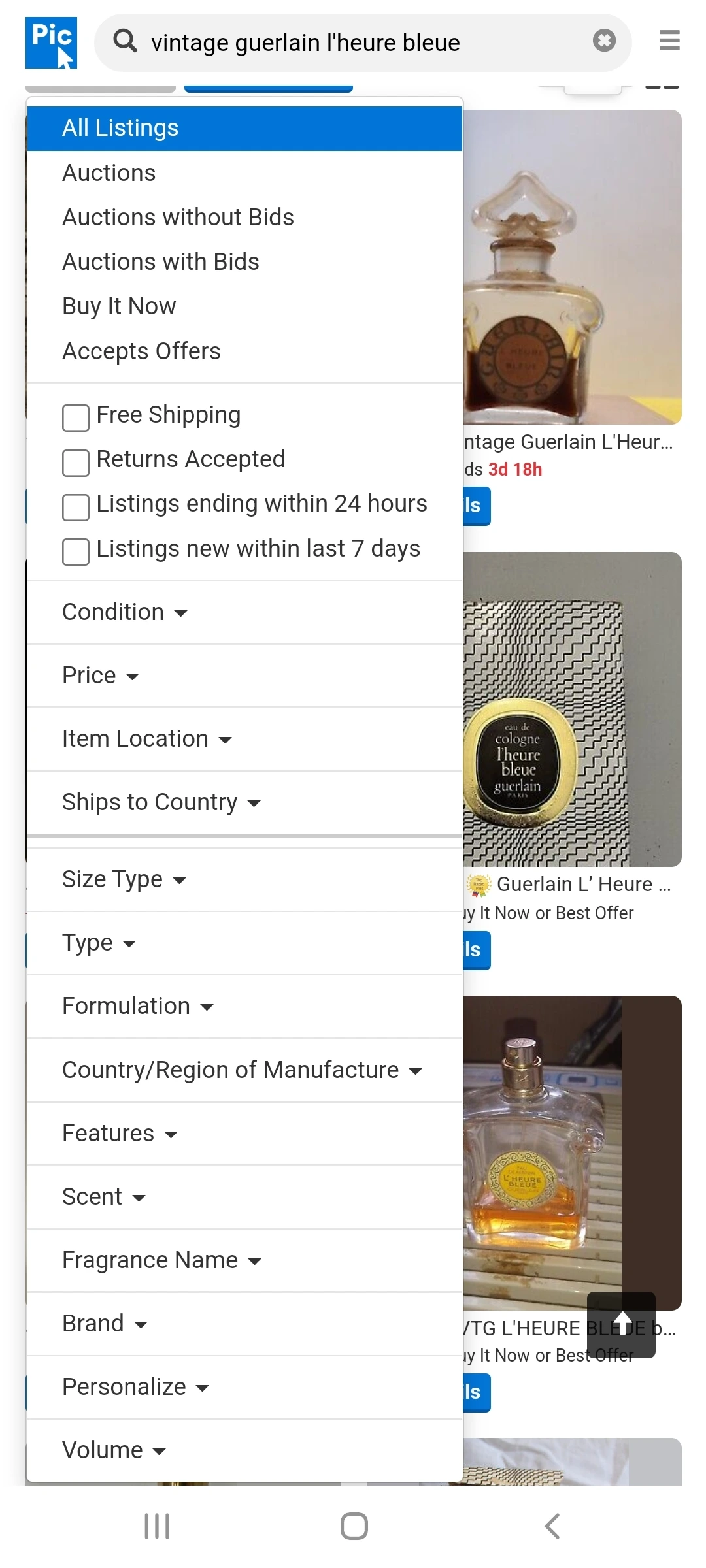 픽클릭의 경우 이베이에서 나오는 모든 기능을 한층 더 접근하기 쉽게 만들어놨다. 예로 빈티지 겔랑 뢰르 블루라고 쳐본다고 하자.