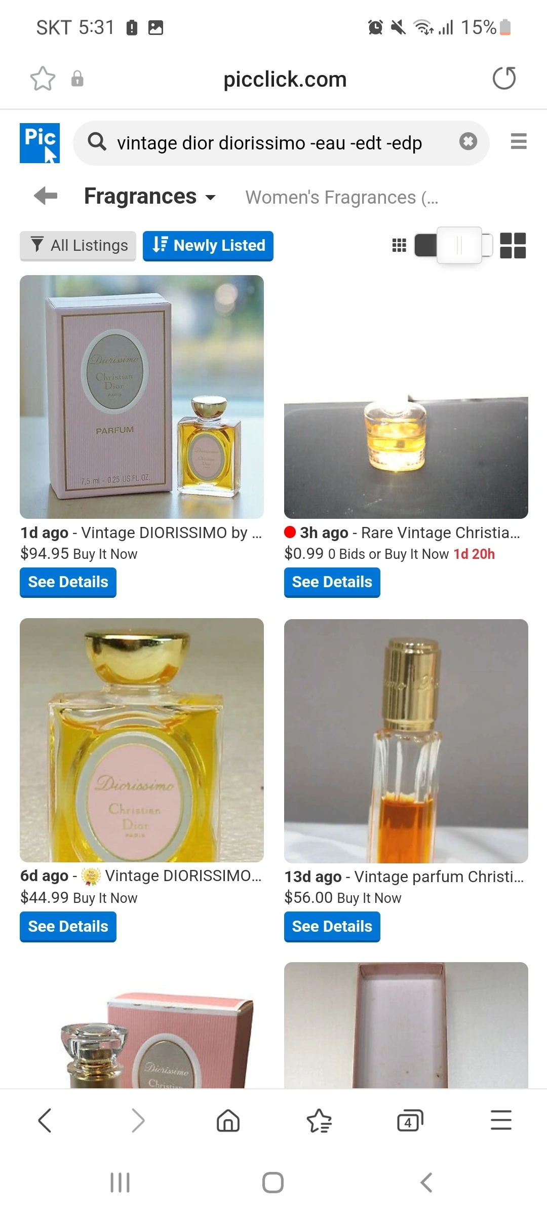 그렇다면 만약, 내가 더 세분화해서 검색하고 싶다면 어떻게 해야 할까? 예시로 빈티지 디올 디오리시모를 원한다고 해보자. 그런데 나는 오 드 뚜왈렛이나 오 드 퍼퓸이 나오는 것이 싫다. 나는 퍼퓸 엑스트레만 찾고 싶다. 그런 경우에는 Vintage dior diorissimo parfum extrait 라고 쳐도 되지만, Vintage dior diorissimo -eau -edt -edp 이런 식으로 원치 않는 검색어 앞에 -를 붙이면, 그 검색어가 들어있는 물품은 검색에서 제외된다.