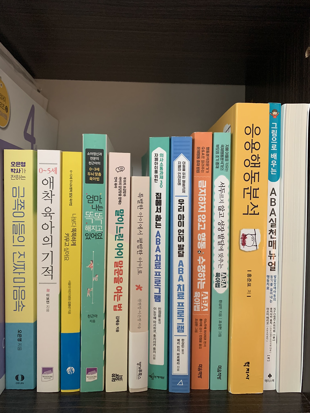 그나마 ‘응용 행동 분석’은 나았다. 영어로는 Applied Behavior Analysis, 줄여서 ABA. 국내에서는 아직 생소한 분야다 보니 그게 뭐 하는 건지 잘 모르는 사람들도 많았고 어쩌다 들어본 적이 있다 해도 ‘자폐’ 치료를 위해 효과적인 방법이라 연관 지을 수 있는 사람은 적었다 (‘적은 듯’ 했다). 쉽게 말해 제목을 들켜도 부담스럽지 않은 책들. 적당히 소화 가능한 제목의 책들은 가지런히 꽂아두고 살짝 마음 쓰이는 책들은 앞과 뒤를 바꿔 돌려 꽂았다. 흰색으로 겹겹이 중첩된 책 페이지만 보이도록 기이하게. 온갖 제목 다 내보여도 스스럼없는 책장 주인이 되고 싶은데 그러기엔 나는 숨기고 싶은 게 너무 많은 엄마인 셈이었다. 가려두고 싶은 게 꽤나 많은 불투명한 엄마표 책장.