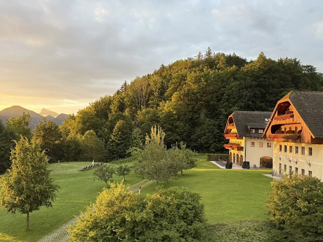 뮌헨 중앙역을 떠난 기차는 한 시간 반쯤 후에 국경을 지나 오스트리아 살츠부르그 역에 도착했다. 역 앞에서 150번 버스를 찾아 짐도 싣고 올라탔다. 가이드북에 따르면, 18 개 정거장을 지나 'hof abzw schloss fuschl'에 내리라고 했다. 정거장 이름도 길고 낯설어 버스 앞의 화면을 열심히 쳐다보았는데 사실은 그럴 필요가 없을 만큼 안내가 정연했다. 호텔은 아라벨라 약도프 레조트 (Arabella Jagdhof Resort)로 호숫가 넓은 풀밭 위로 두 개의 전형적인 알프스 산악 건물들을 중심으로 비치를 포함해 작은 트레일, 수영장 등 휴양시설들을 가지고 있었다. 호텔방에서는 이 프로그램의 하이라이트인 샤프버그 (Schafberg)가 멀리 두드러지게 보였다.