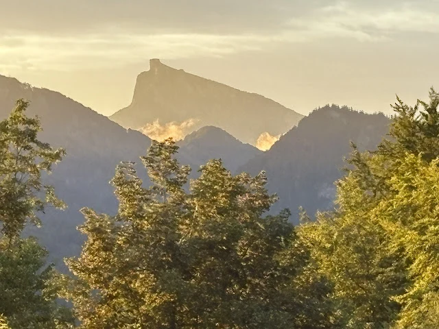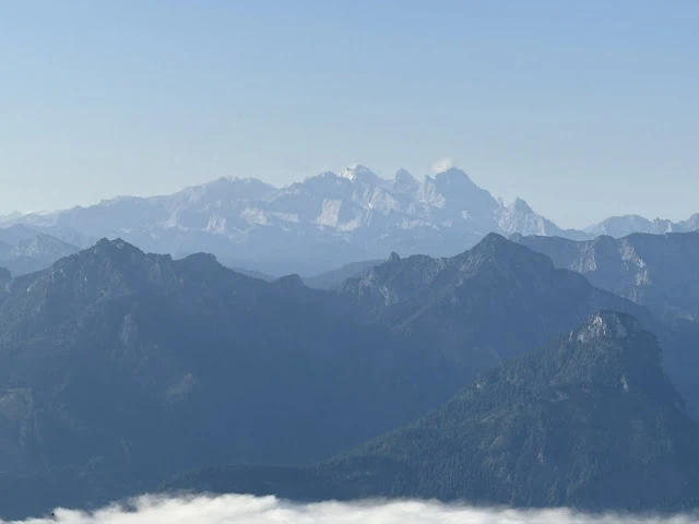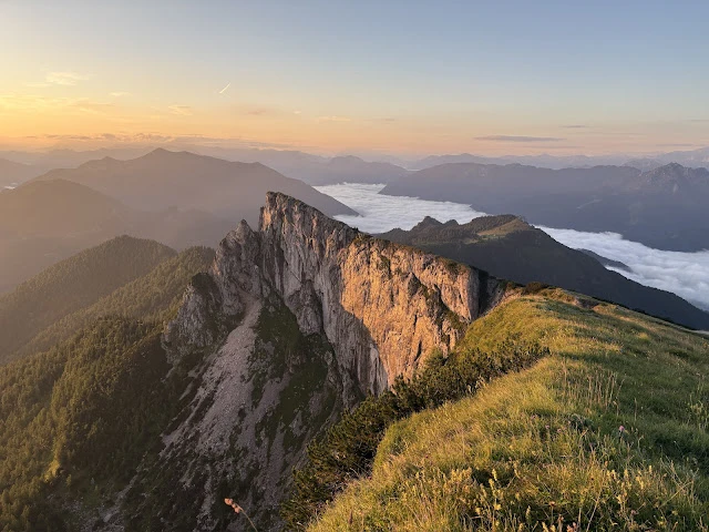 눈뜨자마자 일출을 보러 나갔다. 해는 벌써 제법 올라와 있었다. 붉게 물든 동쪽 하늘과 그 아래 살포시 앉아 있는 몬드호수는 우리를 한참 동안 한자리에 묶어놓았다. 샤프버그 정상 동쪽 끝자락은 아침 햇살이 드리우며 붉게 빛나고 있었다. 그 뒤로는 아직 채 걷히지 않은 구름들이 마치 흐르는 강처럼 우윳빛으로 포근히 깔려 있었다. 그 뒤로는 험준한 오스트리아 알프스가 장엄하게 뻗어 있었다. 정상 서쪽으로는 샤프버그스피츠를 나타내는 십자가가 푸실호와 몬드호 사이에서 두드러지게 보였다.