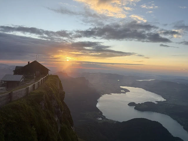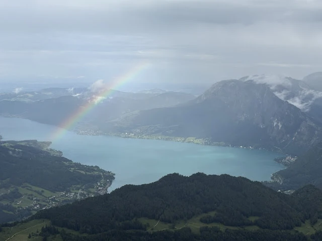 산장에 들어가 점심을 먹고 다시 나오니, 가끔씩 안개가 걷히며 아래 호수들이 흘끗흘끗 보였다. 그러다가 비가 완전히 그치며, 몬드호수 위로는 무지개가 나타났다. 아침만 해도 어슴프레 윤곽만 보여주던 산장 카페도 절벽 위로 솟아나 또렷이 그 모습을 드러냈다. 저절로 흥분된 우리는 자그만 트레일들을 따라 걸었고, 눈아래 펼쳐진 살츠카머구트의 아름다움에 절로 탄성을 질렀다. 저무는 해와 노을은 우리를 한 자리를 떠나지 못하게 비끌어 매어 놓았다. 저녁을 먹고 방에 들어와서도, 여전히 상기된 마음에 수시로 방에 붙어있는 발코니에 나가 아래 보이는 볼프강 호수를 내려다보았다. 밤이 깊어지자, 검은 산등성이 아래로 마을의 불빛들이 구름 사이로 초롱초롱 반짝였다.