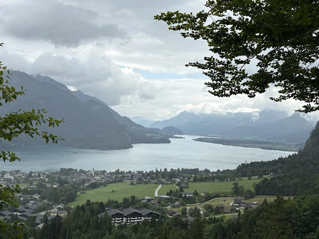여기서부터는 서서히 고도가 높아지면서 절로 땀이 났다. 강하지는 않지만 비도 오락가락했다. 거의 서너 시간 걸으니 눈앞이 트이며, 볼프강호와 상트길겐 마을이 눈아래 산뜻하게 들어왔다. 여기서 우리는 갈길을 선택해야 했다. 계획대로라면, 해발 1376 미터 즈볼퍼혼 (Zwolferhorn)으로 가서, 케이블카를 타고 상트길겐으로 갔어야 했다. 하지만 그러려면 두어 시간은 더 걸어야 했고, 마지막 케이블카 시간에 대지 못할 수도 있겠다 싶었다.