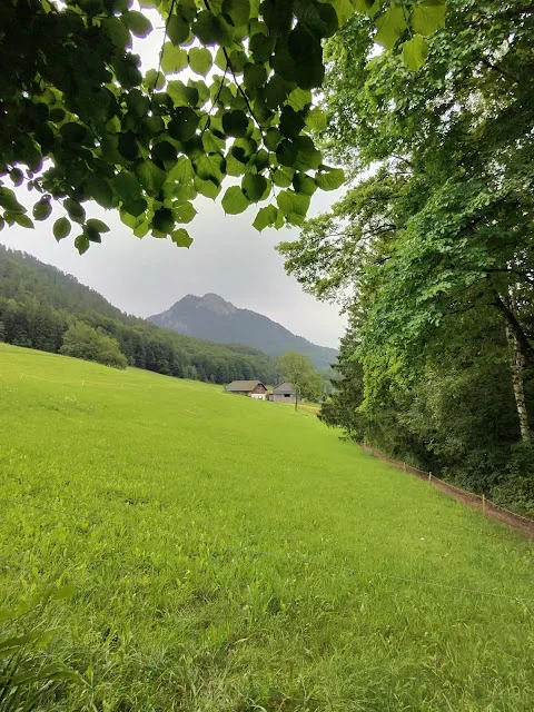일기예보에는 비가 때때로 오는 것으로 되어 있어서, 일단 눈에 띄는 카페에서 간단히 샌드위치와 음료로 스낵을 먹고 갈길을 점검하였다. 푸실암시를 떠나 조금 시간이 지나자, 비가 잦아들어, 탁 트인 시야에 낮으막한 산들 사이로 엘마우탈 (Ellmautal)의 넓은 초원이 들어왔다.