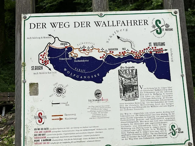 아침에 약간은 개인 하늘이 보였다. 다시 부칠 짐을 남겨놓고 일단 여객선을 타고 바로 다음 정박지인 퓌버그 (Furberg)에서 내렸다. 선착장 바로 앞에 있는 300 년 된 퓌버그 호텔을 끼고 언덕을 올라 유명한 '순례자의 길'로 들어섰다. 표시판은 팔켄쉬타인을 거쳐 상트볼프강으로 가는 길에 대해 설명을 하고 있었다.