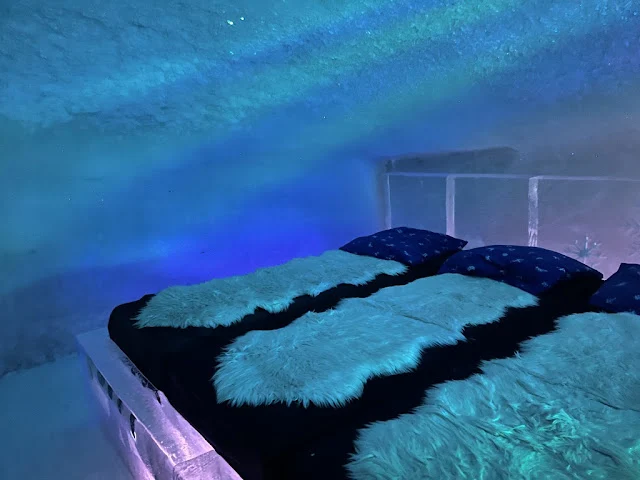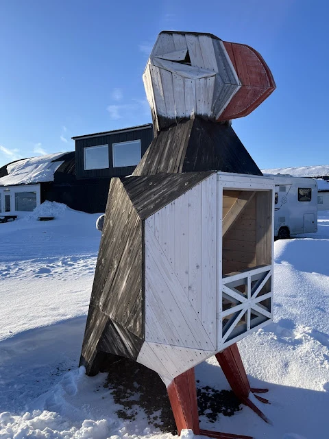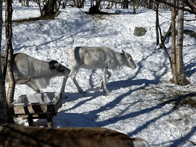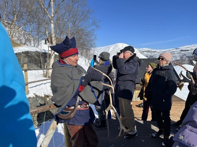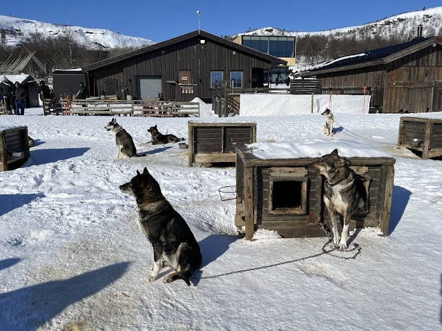 아침 먹고 조금 있으니 배는 북방 항로의 마지막 항구인 키르키네스에 도착했다. 이곳은 러시아와 접경 지역으로 길거리 표지판에서도 러시안 글자를 볼 수 있었다. 배에서 내려 반시간쯤 버스를 타고 도착한 곳에서는 여러 액티비티가 있었다. 스노모빌과 개썰매 프로그램이 있었다. 나는 둘 다 하지 않기로 하고 대신 썰매를 끄는 개들을 보러 갔다. 썰매가 준비되는 동안 개들은 흥분해서 소리 내며 자기가 뽑혀 가기를 기다리는 것 같았다. 근처에는 순록들이 사육되고 있었고 그것을 지키는 사미 (Sami) 원주민이 구경꾼들에게 이곳 생활에 대해서 이야기해 주었다. 같은 시설 내에는 얼음집으로 꾸며진 스노 호텔이 있어 이방 저 방 구경했다. 내부에는 얼음으로 만든 장식들이 여기저기 있었다.