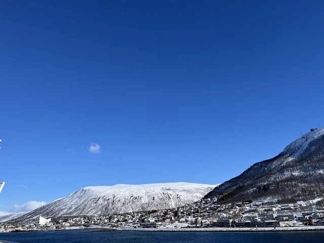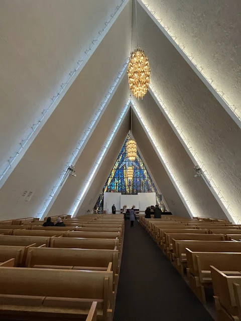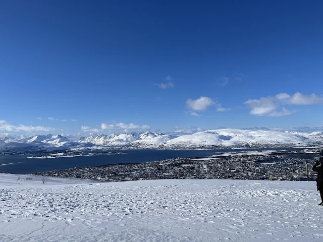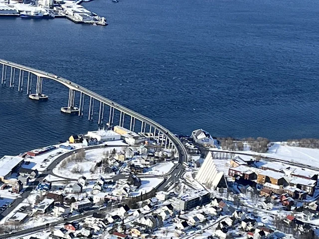 계속 지나치는 섬들을 바라보며 시간을 보내다 보니 오후가 되었고, 이내 배는 트롬쇠에 도착했다. 우리를 태운 버스는 구시가지를 벗어나 큰 바위라는 뜻의 스토르스타이넨 (Storsteinen)을 향했다. 폘하이젠 (Fjellheisen)이라 불리는 케이블카를 타고 정상에 오르니 너른 눈밭이 우리를 맞아 주었다. 여기서 내려다보는 트롬쇠는 19 세기에는 '북쪽의 파리'라 불렸다 한다. 거의 파리를 흉내 낼 만큼 다양한 문화가 의외로 발달했었다 한다. 육지와 연결된 다리 옆으로 삼각형들을 여러 개 포개놓은 듯한 북극의 교회 (Arctic Church)가 보였다. 산을 내려와서 교회에 들렸다 구시가지를 걸어 다녔다.