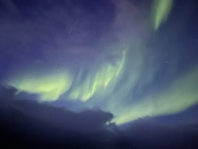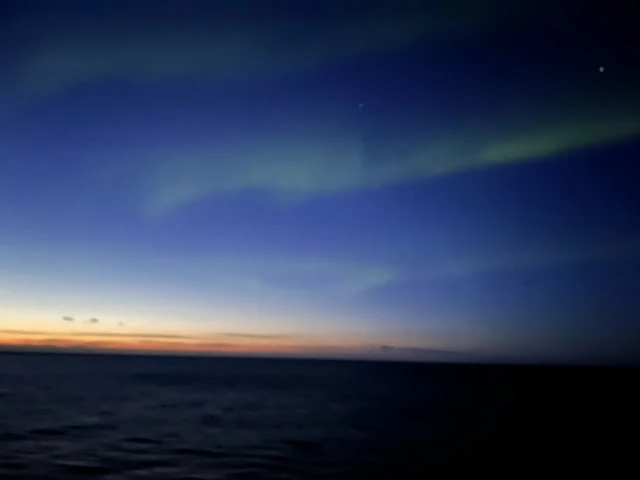 배에 돌아오니 오늘 저녁에 오로라를 볼 가능성이 있다고 방송했다. 석양이 지고 어둠이 찾아오자 설레는 가슴을 안고 옷도 갈아입지 않고 침대에 누었다. 자정이 지나자마자 오로라가 나타난다는 방송이 나왔다. 방에서 뛰어나가니 갑판은 흥분한 사람 들이 빼곡히 서서 모두 정신없이 하늘을 쳐다보고 있었다. 몸에 전율을 느끼며 하늘에 시선을 고정하며 한참을 지내고 있는데 여기저기서 사진을 찍느라 야단들이었다. 나도 얼른 하늘을 향해 전화기를 꺼내 들었다. 그러나 전문가가 아니니 생생한 느낌을 전혀 담을 수가 없었다. 그저 거의 매초 모양을 바꾸는 오로라는 경이라고 밖에 할 수 없었다.