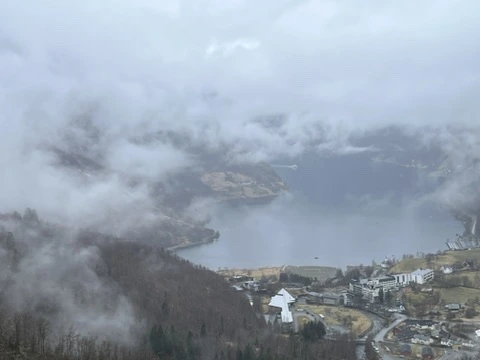 산에 올라 내려다본 게이랭거. 화살모양 지붕은 피요르드센터이다