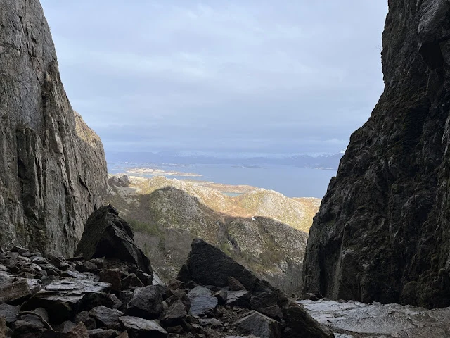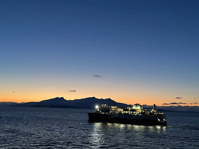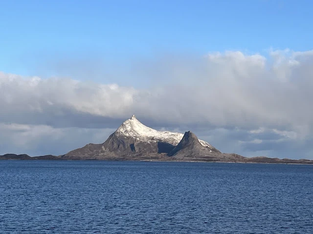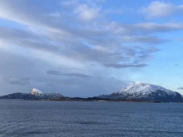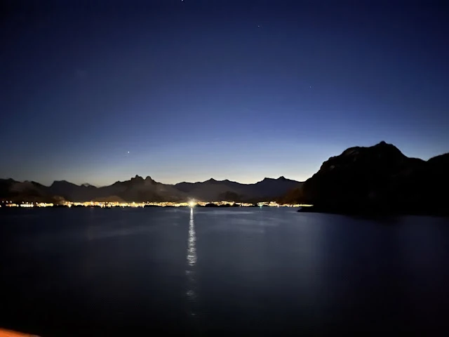 점심을 먹고 나니 배가 보데에 도착했다. 하선하여 버스를 타니 마을에서 조금 떨어진 바닷가 비치에 내려 주었다. 가이드가 스파이크와 하이킹 폴들을 나누어 주면서 간단한 주의사항들을 알려 주었다. 대부분 상식적인 안전에 대한 주의 사항들 외에 특히 환경을 훼손하지 않도록 해야 한다는 점을 강조했다. 구릉에서 시작해 긴 모래사장도 지나고 굵은 돌들이 많은 비치도 지났다. 눈이 아직 녹지 않고 얼어있는 길도 지났다. 두어 시간 걸은 뒤 배에 돌아왔다. 이어서 배는 많은 섬들 사이를 항해했다. 석양이 지고 이내 어두워가는 마을의 불빛들이 눈에 들어왔다. 유명한 로포텐 (Lofoten)으로 통하는 스볼버 (Svolver) 섬에서 빛 밝히고 있는 마을 전경이 보였다.
