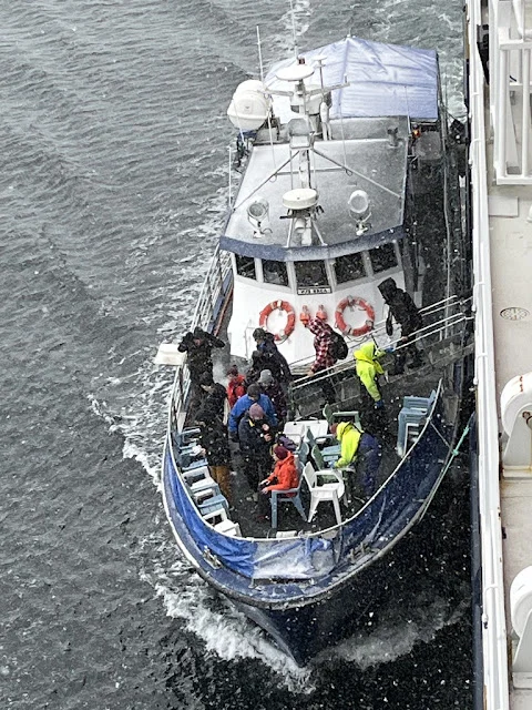 독수리 구경 떠나는 사람들이 작은 보트로 옮겨 타고 있다.
