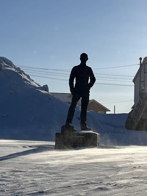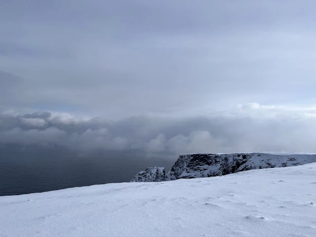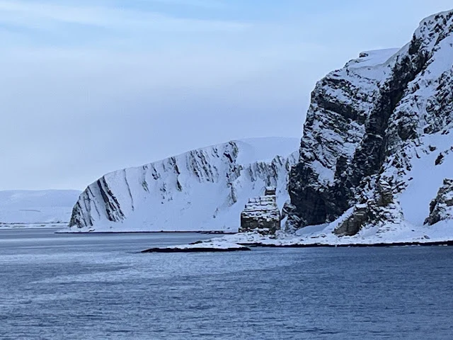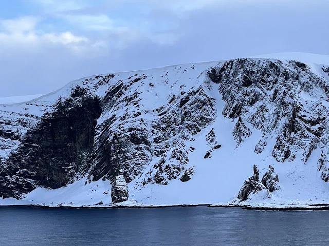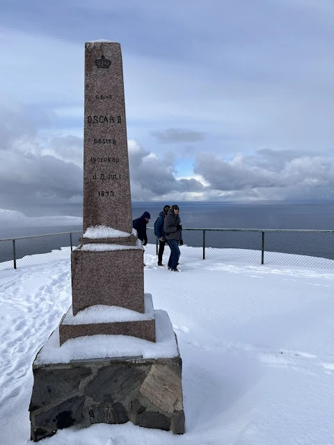 아침 먹고 방에 들어가 여러 겹 옷으로 갈아입고 하선할 준비를 했다. 호닝스베그 (Honningsvag) 항구에서 여러 대 버스에 나누어 타고 노스케이프로 향했다. 노스케이프는 유럽에서 육지로 연결된 길로 갈 수 있는 최북단이라 한다. 버스에서 내리니 노스케이프를 나타내는 '북위 71 도 10 분 21초'라 쓰여있는 표지판이 눈에 뜨였다. 깎아지른듯한 절벽 위로 하얀 눈으로 뒤엎인 평원이 그날따라 잔뜩 찌푸린 북대서양의 하늘 아래 펼쳐 저 있었다. 노스케이프의 상징인 구 모형 아래에서 기념촬영을 했다. 1873 년 노르웨이 오스카 2 세 방문 기념비도 있었다.