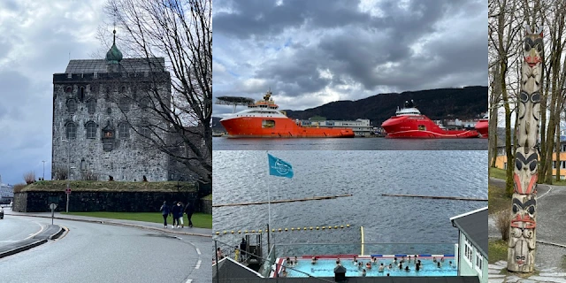 버겐항구 따라 걸으며 본 로젠크란츠타워, 항구, 토템폴, 노천수영장