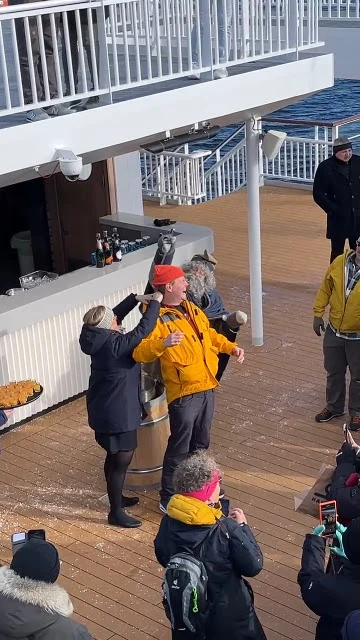 북극권 지나는 기념으로 승객들 옷 속에 얼음을 쏟아붓는다.