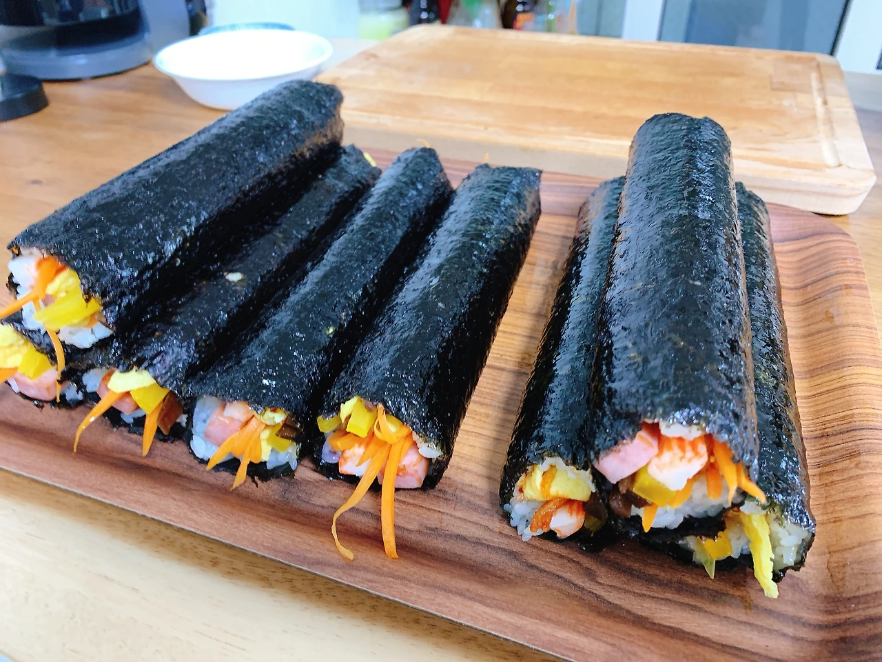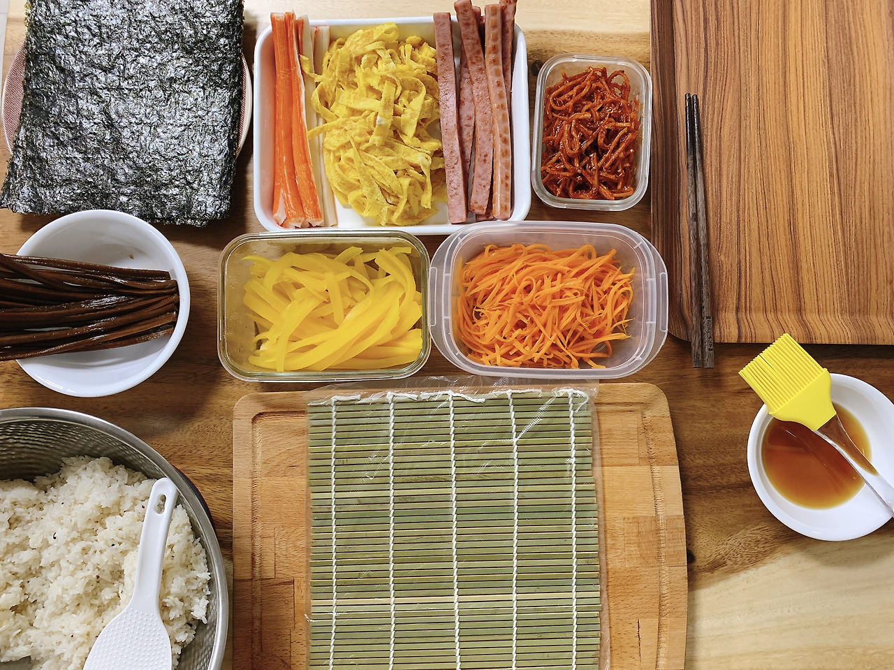 허둥지둥 준비한 재료를 식탁 한쪽에 늘어놓기 시작했다. '아 김밥 하나를 마는데 이렇게 많은 것들이 필요하구나' 그때 다시 한번 깨달았다. 그래서 어릴 적 엄마가 김밥을 싸는 날이면 부엌 바닥에 잔뜩 차려놓고 하셨는지 이제야 알았다.