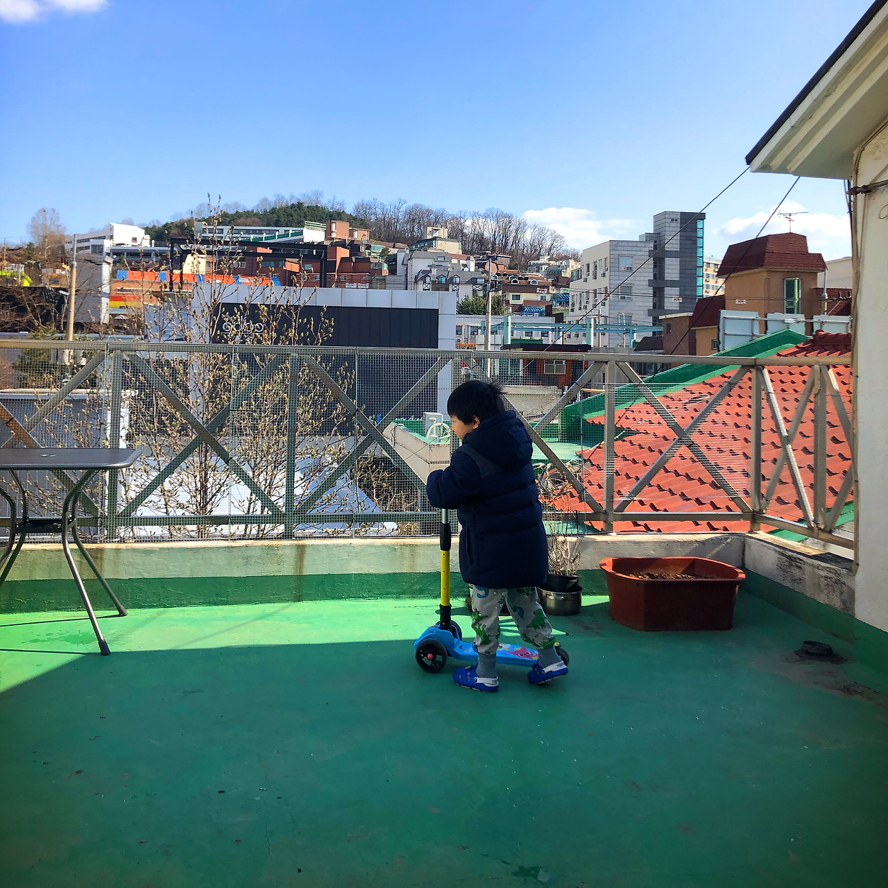 아이와 나는 주택에 사는 덕분에 작은 옥탑에서 바깥바람을 쐰다.