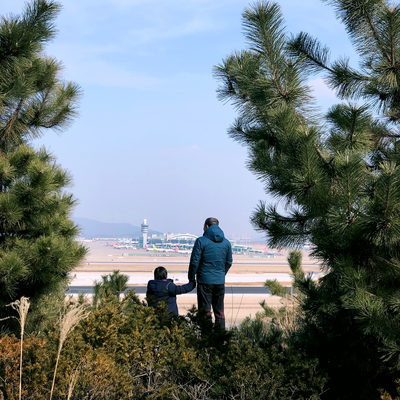 인적 드문 주차장에서 외할아버지와 공항 구경을 하는 아이.