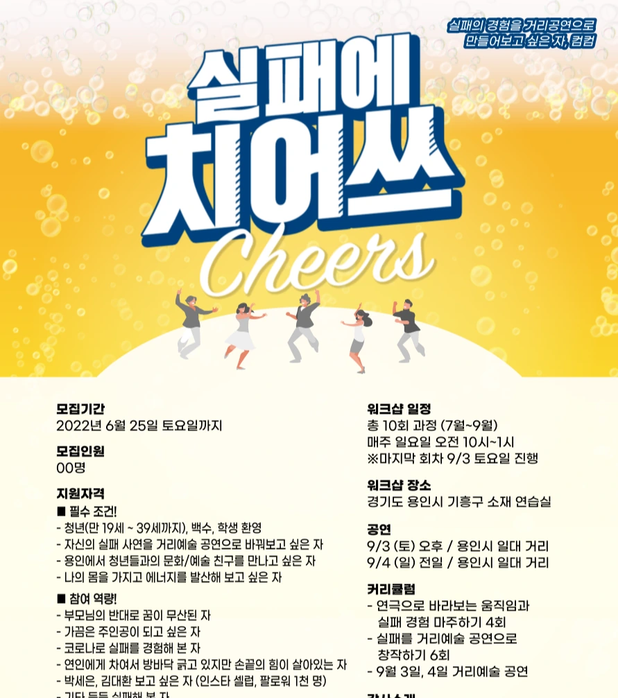 앞서 서두 부분에 ‘실패 데이’, ‘실패 사연 공모전’을 언급했었는데 얼마 전, 비슷한 주제로 같은 지역 소속 청년들과 함께 2달간 프로젝트를 진행했었다. 슬로건은 “실패에 치어쓰!” 로 우리의 고민과 실패 사연을 서로 나눠보고, 보다 생동감 넘치는 ‘움직임’이라는 예술형태로 표현해보는 시간이었다. 전문 강사 지도 하에 2달간의 워크숍을 거친 후, 시민들 앞에서 거리공연을 선보이기도 했다.