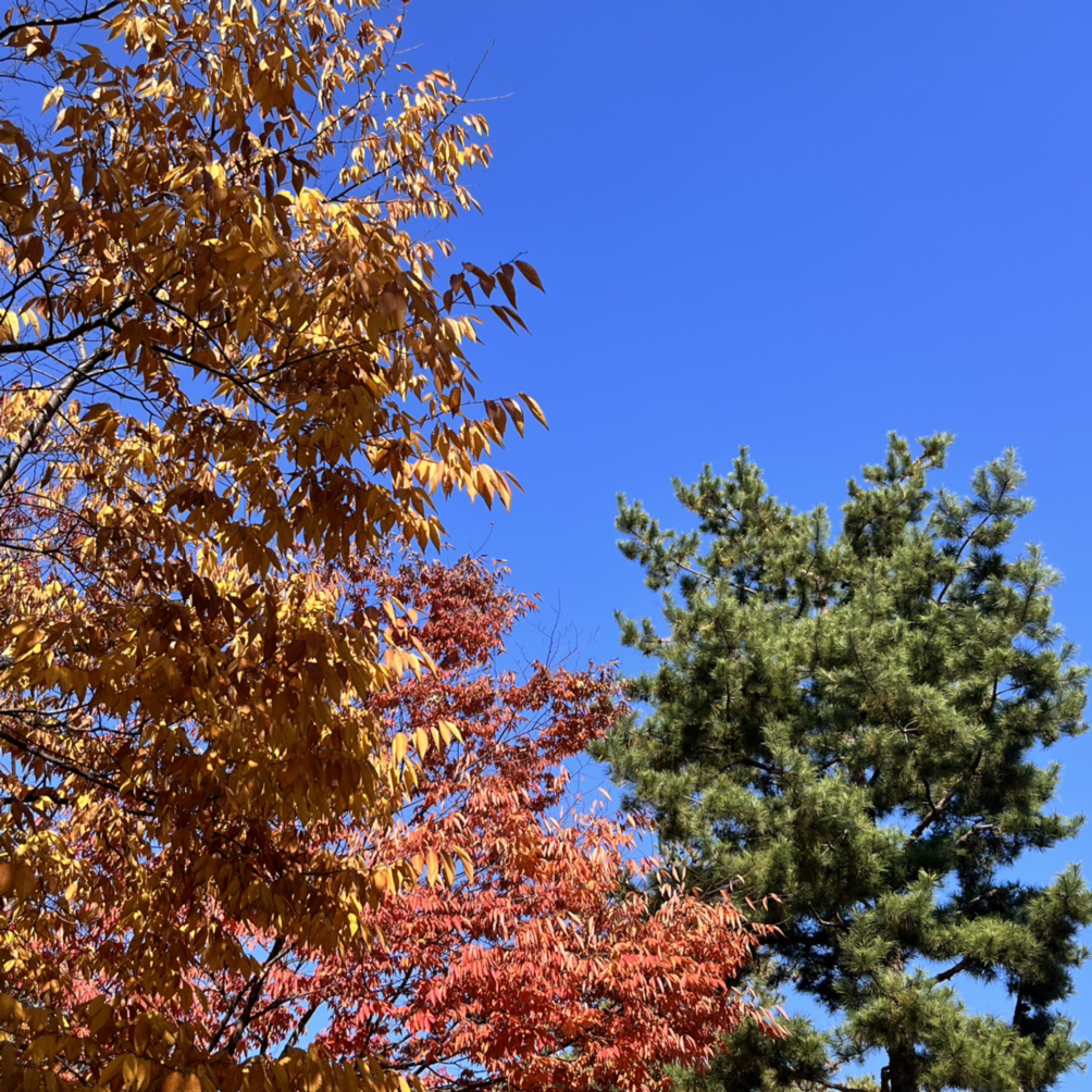 가을에만 만끽할 수 있는 알록달록 단풍들의 향연. 맑은 하늘색 바탕에 무지개 색깔마냥 빨주노초 잎사귀들의 색 조합이 참 아름답다.