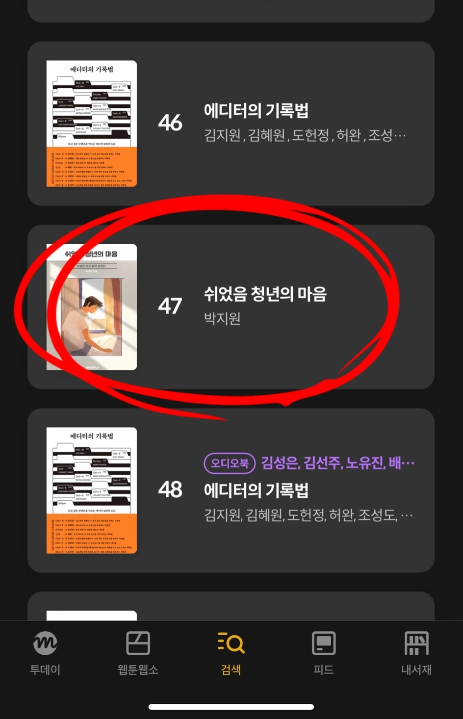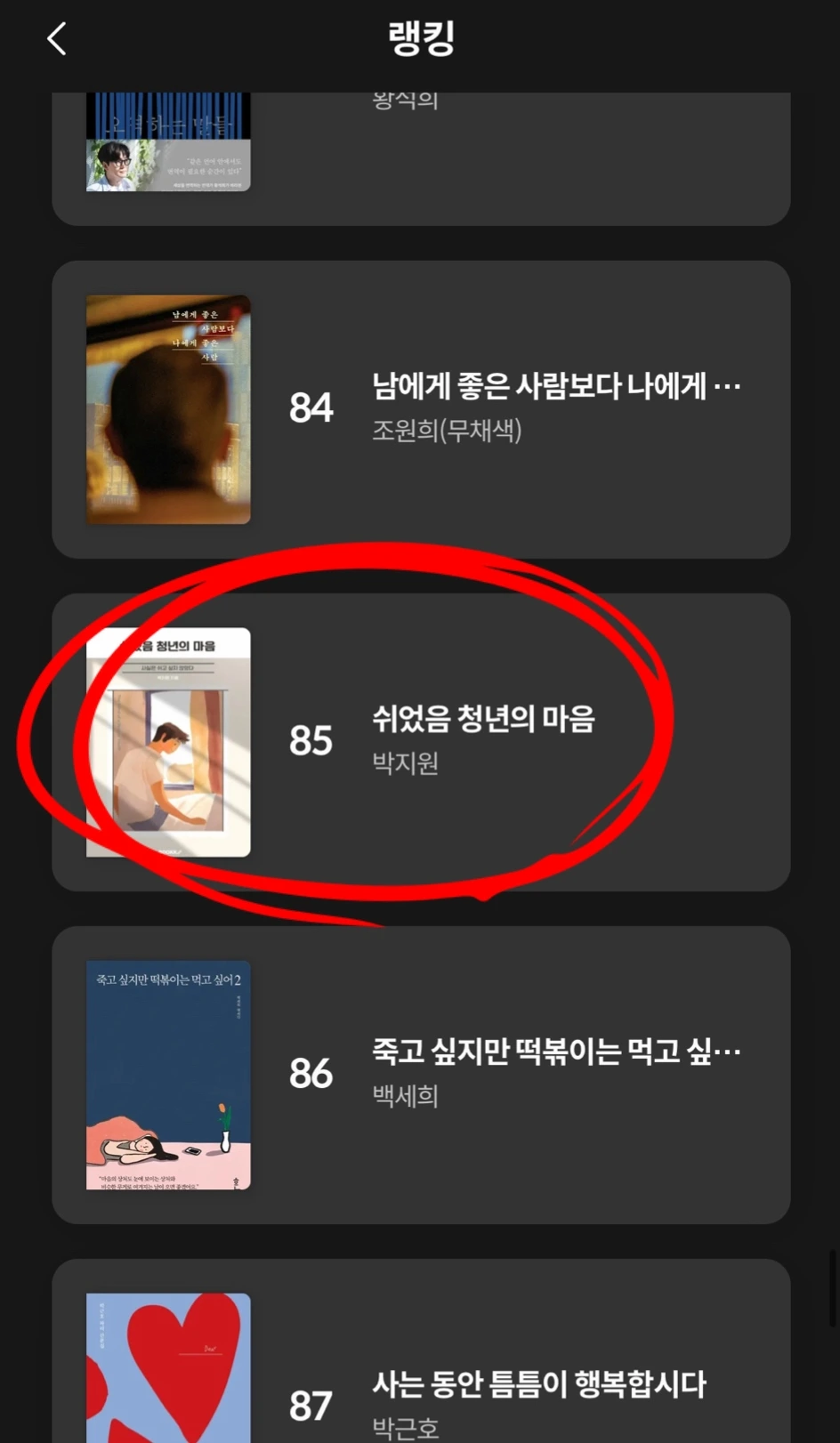 에세이 『쉬었음 청년의 마음』이 밀리의 서재 에세이 랭킹 100위 안에 진입했다.