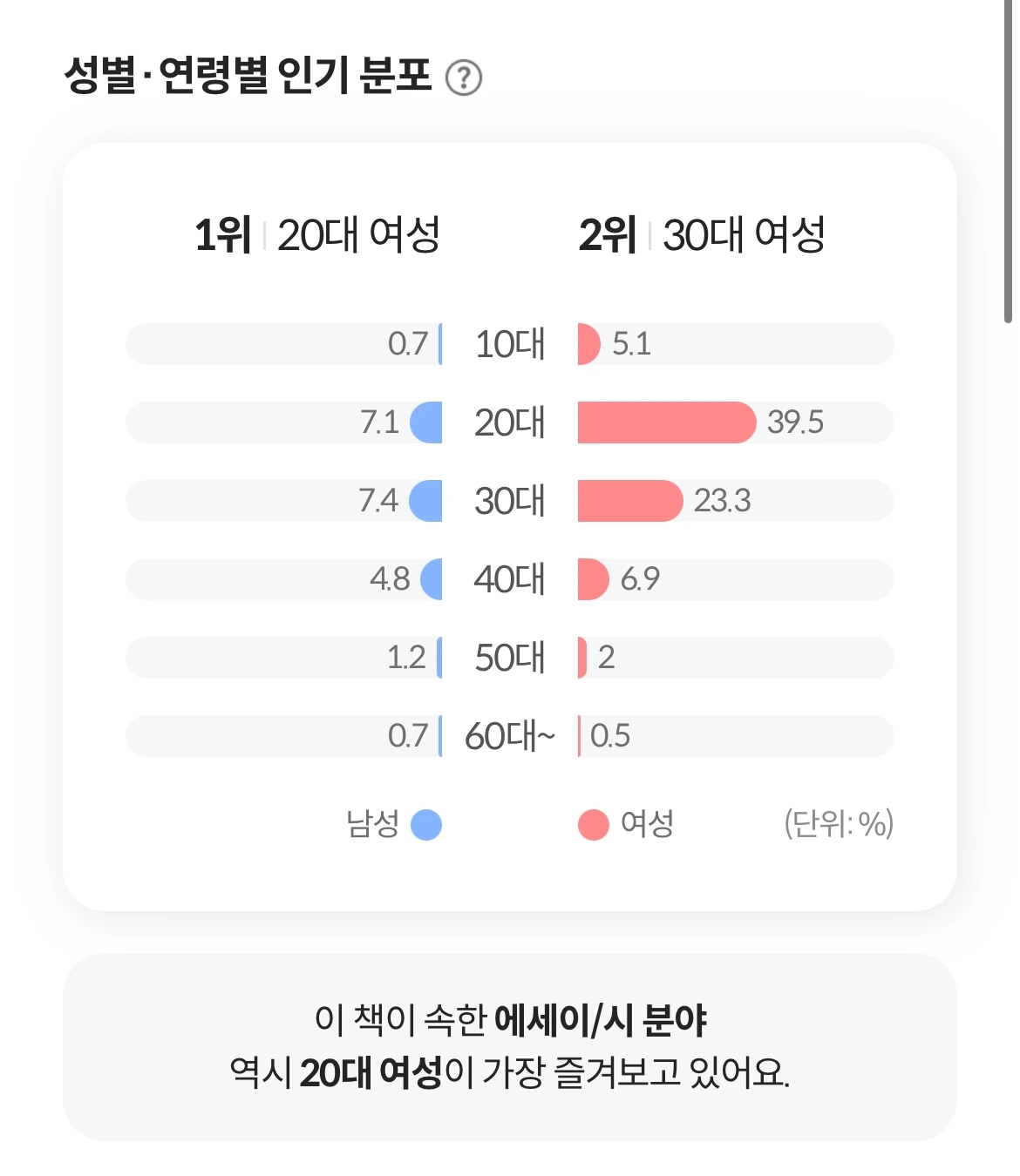 완독률도 의미 있는 수치다. 현재 완독률은 66%로, 밀리의 서재 에세이·시 분야 평균 완독률인 약 55%를 넘어선다. 밀리의 서재 지표 기준으로, 이 정도 완독률은 ‘홀릭:부담 없이 술술 읽다 보면 빠져드는 책’에 해당한다. 독자들에게 어느 정도 선택을 받고 있다는 신호로 느껴져 뿌듯하고 감격스럽다.
