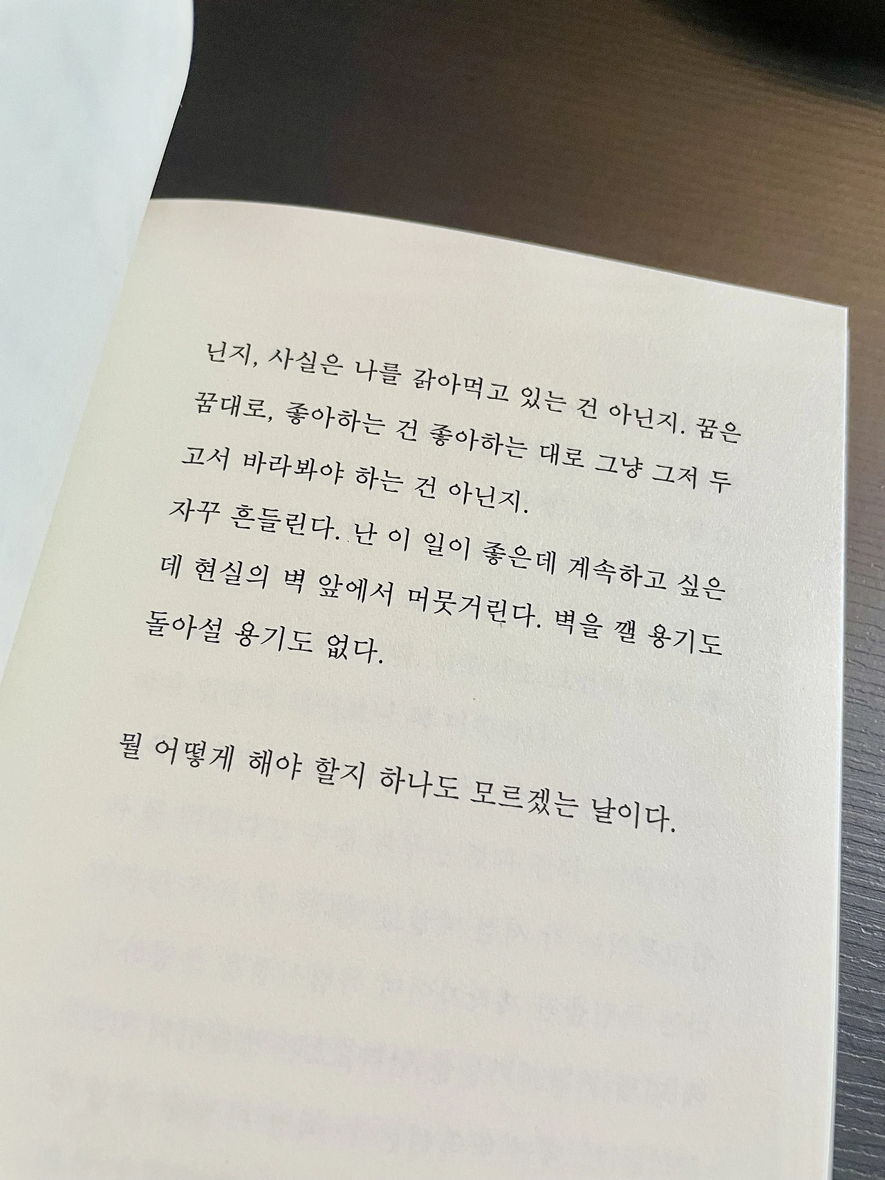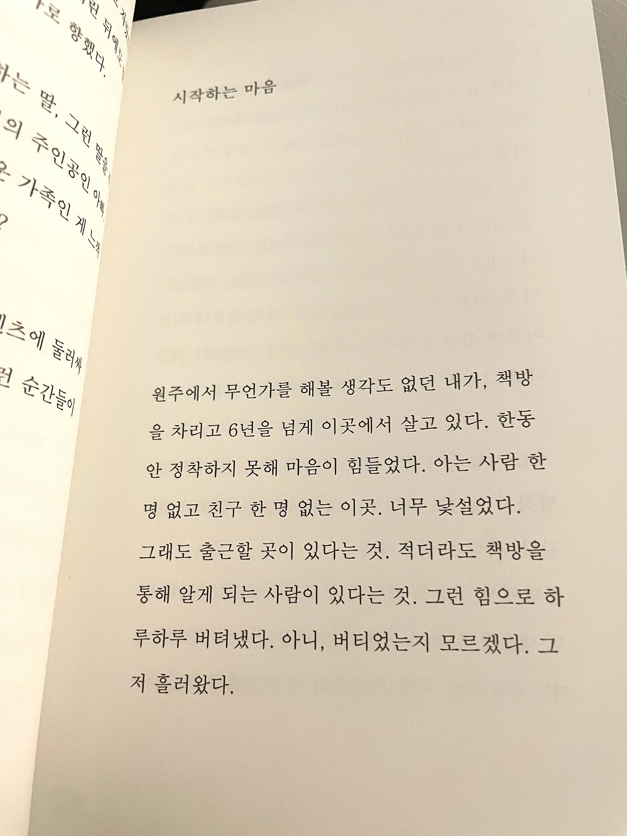 책 속에는 작가님의 일상적인 생각들이 단편적으로 기록되어 있었다. 특히 책방을 운영하며 느꼈던 감정과 상황들이 솔직하게 드러나 있었는데, 조언이나 가르침 없이 스스로 고민하고 선택하며 나아가는 모습이 담겨 있어 좋았다.