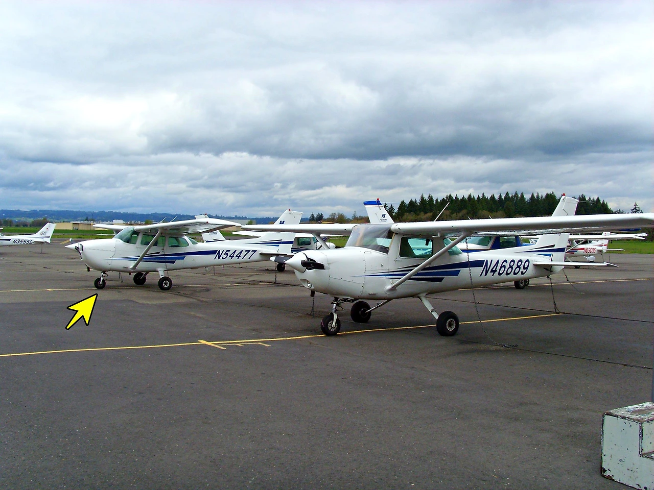 화살표가 가리키고 있는 항공기가 C-172입니다. 옆에 있는 C-152와 비교해 보시면 뒷자리에 유리가 하나 더 있는 것을 확인하실 수 있을 것입니다. 즉, C-172는 4인승 항공기라는 뜻입니다. 더 크고 무거운 항공기인 만큼 C-152보다 Rent 비용도 기름 값도 더 많이 듭니다.