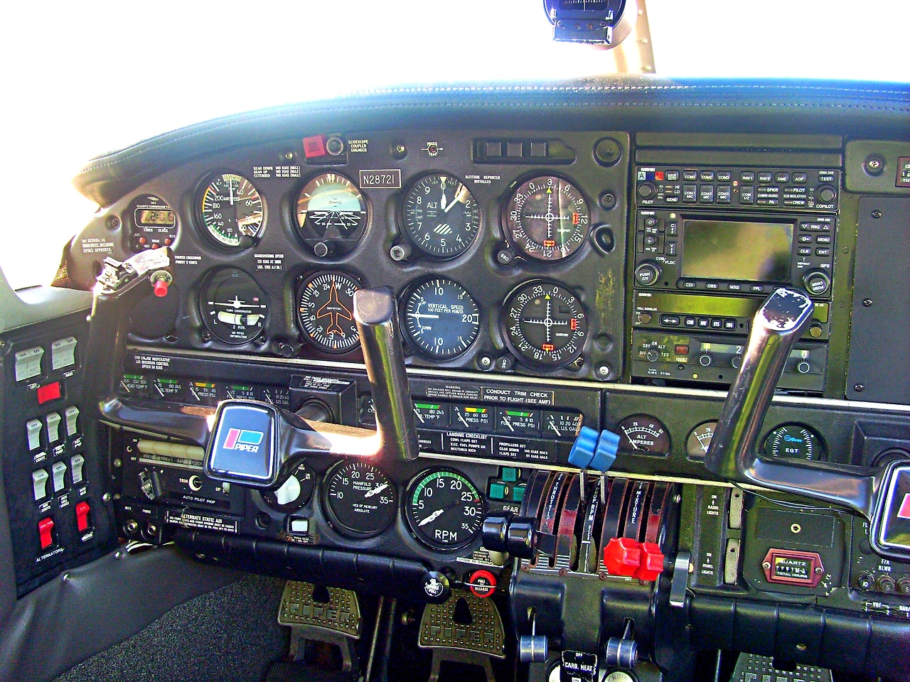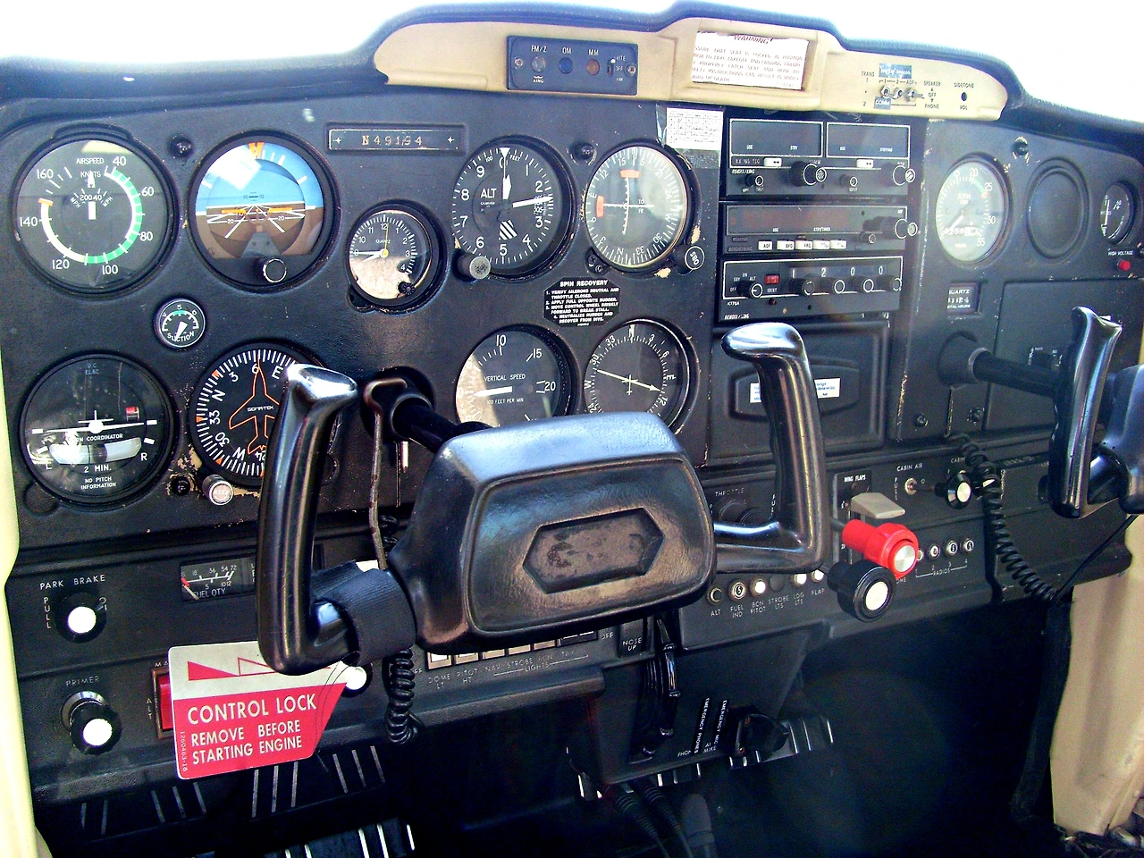 C-172의 조종석입니다. 위 C-152 조종석보다는 확실히 더 많은 계기들이 조밀하게 모여 있는 것이 보이시죠? 우측에는 GPS도 붙어 있는 게 보입니다.