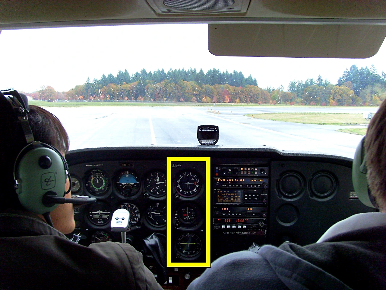노란색 네모 박스 안의 계기가 계기 비행을 위한 핵심 계기라고 보시면 됩니다. 그 왼쪽에 있는 6개의 동그란 계기들은 C-152에도 똑같이 붙어 있는 시계 비행에서나 계기 비행에서나 모두 사용되는 공통된 계기입니다. 노란색 네모 박스 안의 계기들을 보시면 하얀색 바늘이 십자가 모양을 하고 있는 게 보이실 겁니다. 사진은 땅에서 찍은 사진이지만 공중에서도 지상 장비가 보내는 신호를 잘 잡아 제대로 된 방향으로 비행을 하고 있으면 보통 저렇게 십자가 모양이 나온다고 보시면 됩니다. 저 십자가 모양을 이루고 있는 바늘이 좌나 우 혹은 위나 아래로 벌어져 있다면 무언가 잘 못 된 것이라 생각하시면 쉽습니다.