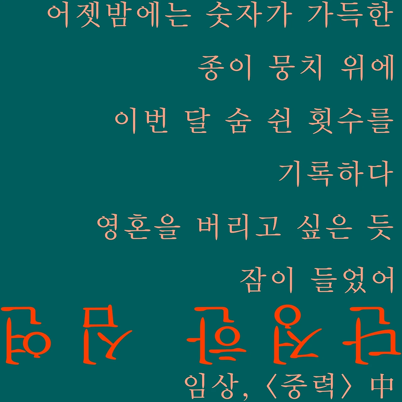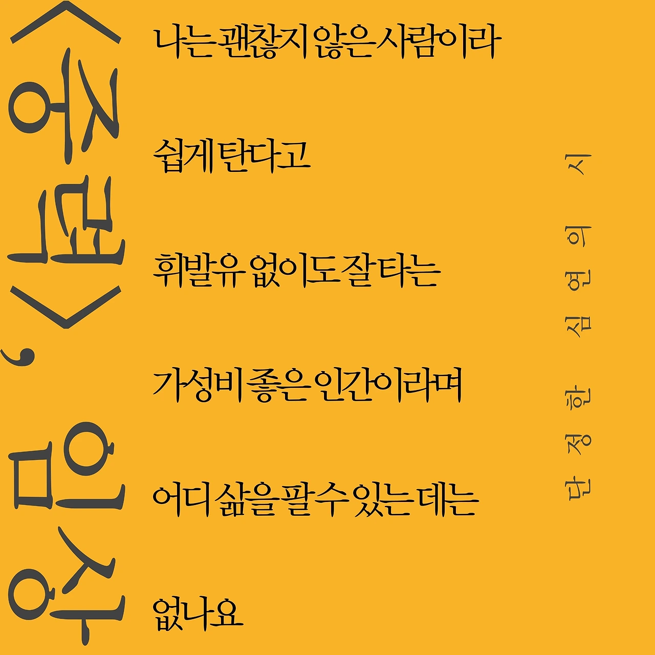 어젯밤에는 숫자가 가득한 종이 뭉치 위에 이번 달 숨 쉰 횟수를 기록하다 영혼을 버리고 싶은 듯 잠이 들었어 지겹지만 깨워줄 이 아무도 없는 잠꼬대도 하고 숨 막는 대신 꿈도 꿨어 평생 숨 쉴 수 있는 황홀하고 거지 같이 아름다운 숫자들을 한 아름 갈비뼈 활개 치듯 안았는데 일어나니 눌린 목주름과 조명발이 병든 마트 구석 문드러진 수레 위 알뜰 코너에서 집어 온 뼈다귀 같은 오이가 냉장고에 들어 있는 집이 내 집이었어 그러니까