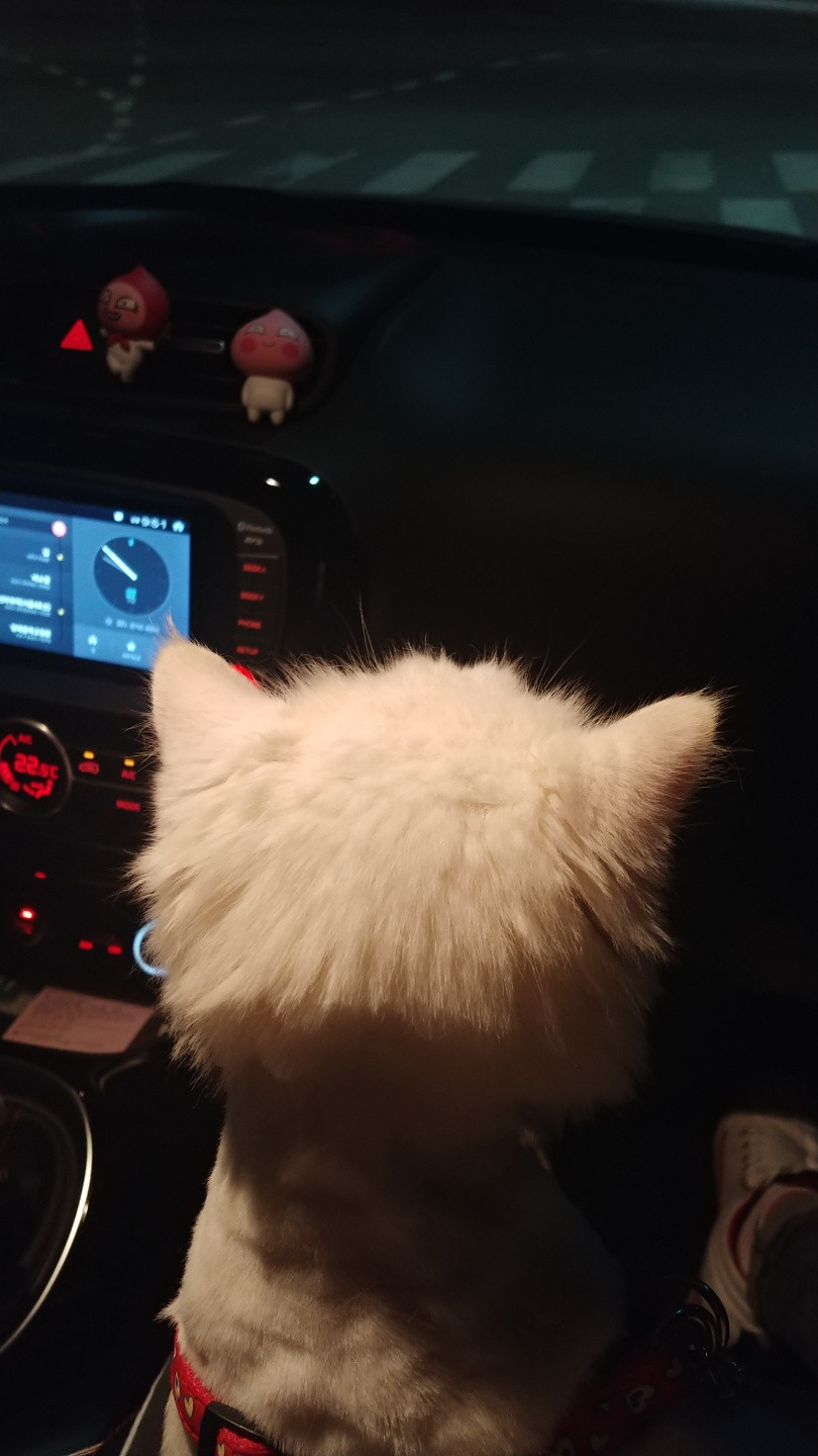 발치 수술 때문에 한동안 병원을 자주 다녔는데, 차 안에서 얌전히 차창 밖 풍경을 감상하는 조그만 뒤통수가 그렇게 귀여울 수 없었다. 흰둥이는 스트릿 시절을 겪어봐서 그런 건지 원래 무던한 성격인 건지는 잘 모르겠지만 집 밖에 나가는 것에 대해 거부감이 적었다. 특히, 차에 타는 것에는 꽤 안정감을 보였다.