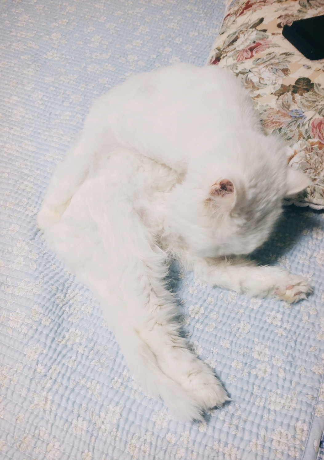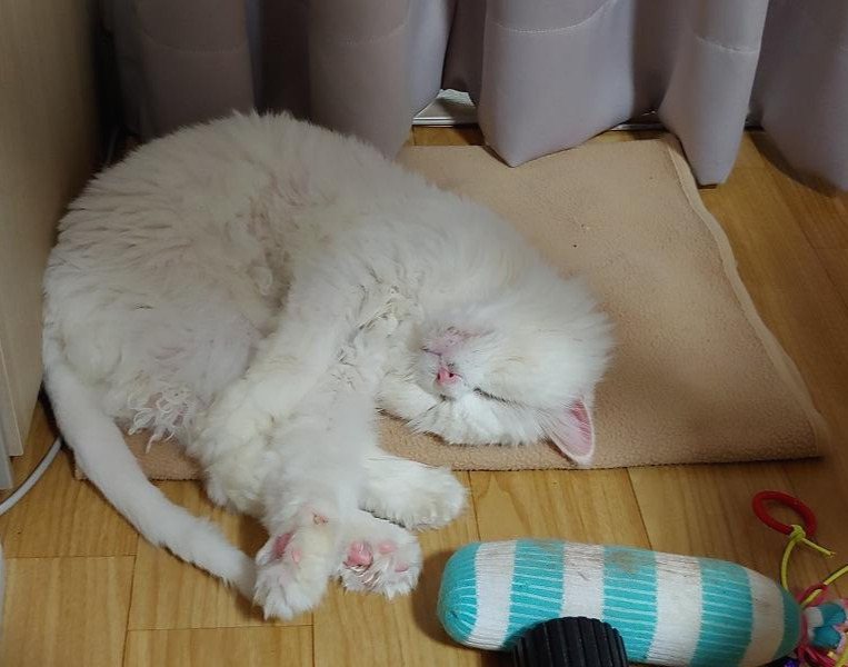 흰둥이는 수술 후 원래 늘 함께 자던 내 옆자리가 아닌 방바닥 구석 후미진 곳에서 잤고, 컨디션이 급격히 떨어져서 토하거나 설사를 자주 할 때는 화장실 안에서 하루 종일 웅크리고 있었다.
