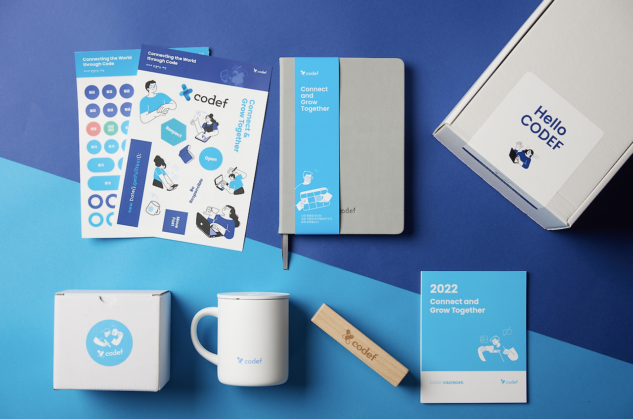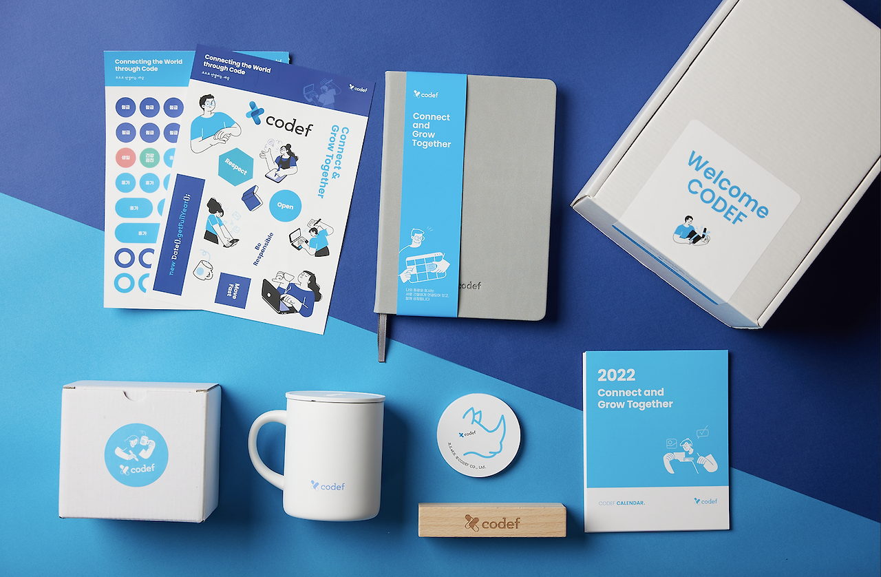 기존의 구성원에게는 “Hello CODEF”라는 친근한 인사로, 신규 구성원에게는 “Welcome CODEF”라는 환영의 인사로 아주 약간의 메시지만 바꾸었다. 같은 구성품, 같은 모양이어도 어떠한 형태와 방식으로 전달되는지에 따라 매우 다른 사용자 경험을 이끌어낼 수 있기 때문이다. 코드에프는 올해 같은 듯 다른 디자인으로 포장하여 각 구성원에 효과적인 메시지를 전달하고자 했다.