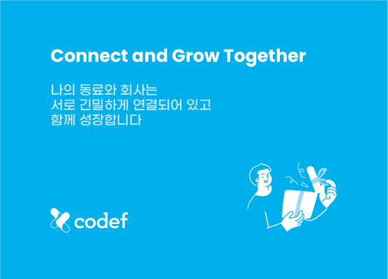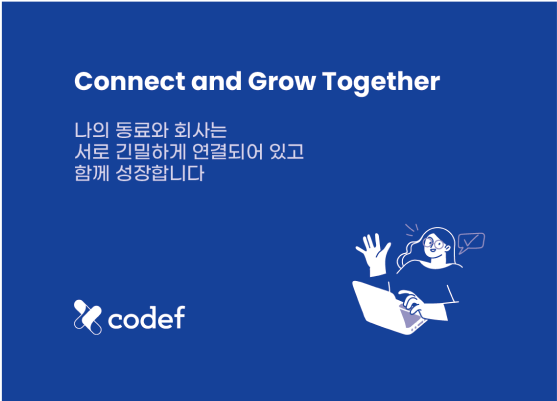 2021-2022년 코드에프가 내부 브랜딩에서 가장 중요하게 여긴 가치는 연결과 성장이다. 무엇보다 “연결”이라는 가치는 코드에프가 내외부적으로 포기할 수 없는 가치 중 하나다. 그렇게 해서 결정된 것은 “Connect and Grow Together”. 이제 이 슬로건은 우리의 내부 슬로건으로 사용될 것이다.