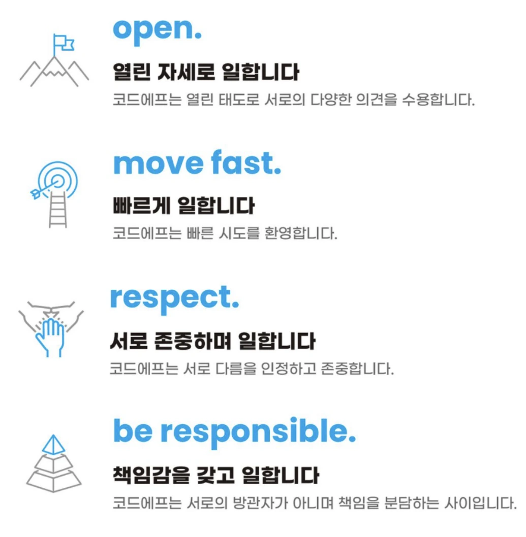 우리가 가장 중요하게 생각하는 가치, “Open” “Move Fast” “Be Responsible” “Respect” 네 개의 단어를 중심으로 네 가지 가치를 풀어내어 정리했다. 네 개의 단어를 우리에게 맞는 언어를 사용하여 문장으로 풀어내고, 여러 번의 탈고를 통해 워딩을 다듬었다.
