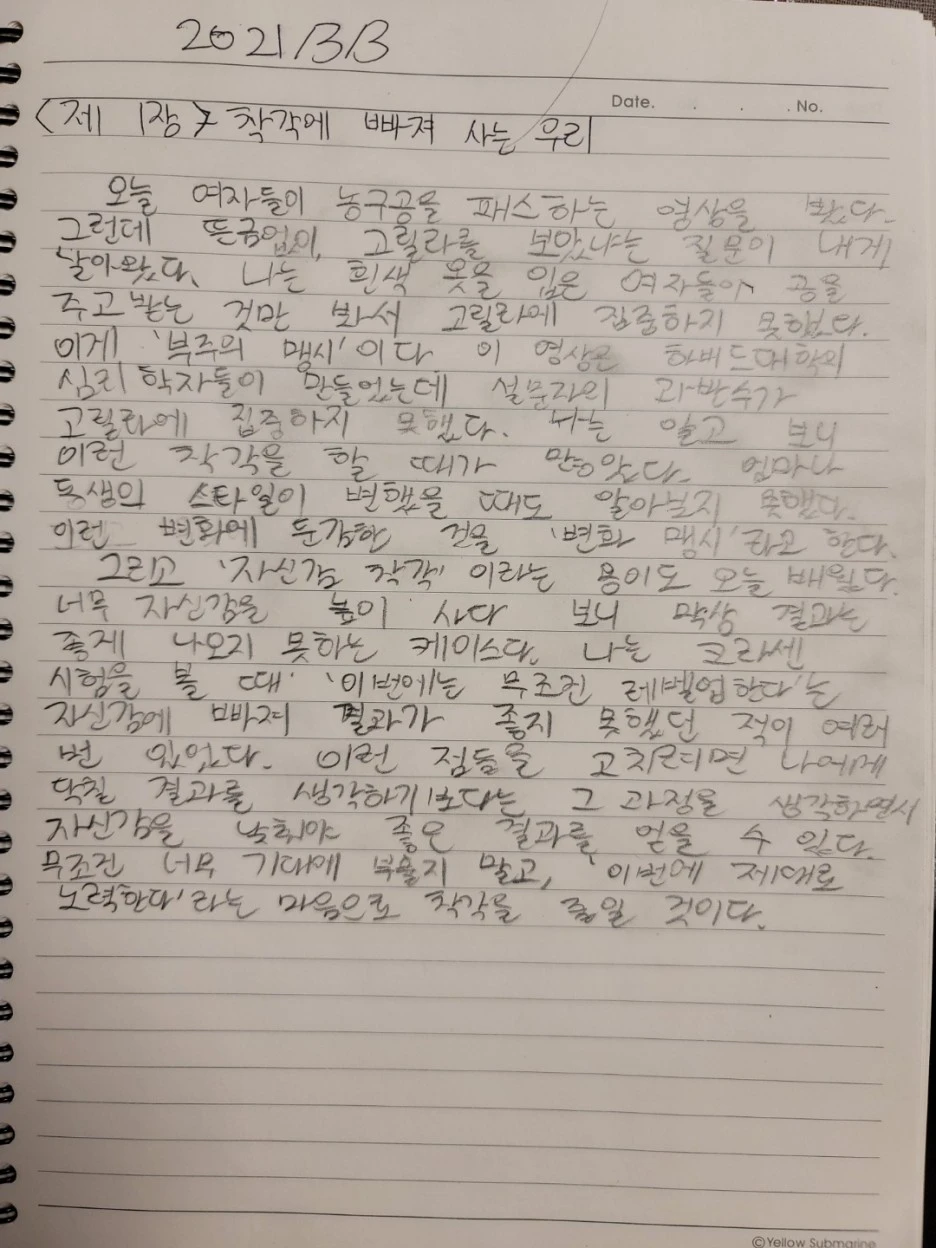 이 실험 결과를 들으니 하인츠 코헛이 말하는 '과대 자기'가 생각났다. 그는 사람이 어렸을 때 부모와의 관계에서 발달시켰어야 할 '건강한 자기애'를 형성하지 못하면 그 아이는 자신의 전능성을 지키기 위해 자신을 과대하게 포장하기 시작한다고 말한다. 어린 아이에게 남아 있다가 서서히 없어져야 할 '고태적 과대 자기'가 계속 남아 있으면 이상은 높으나 자신의 현실적 능력과는 괴리가 매우 큰 상태로 살명서 고통 받게 된다는 것이다. 누구나 이상과 현실의 간극은 존재한다. 그럼에도 그 간극의 긴장을 견딜만한 자아의 힘이 약하면 심리적 고통에 휩싸이고, 그 고통을 극복해 보려 하는 노력은 심리적 '증상'으로 나타난다. 아들과도 앞으로 진정한 자신감이 무엇인지 기회가 될 때마다 대화를 나눠보고 싶다. 아들은 오늘 나름대로 깨닫는 게 많아 보이는 듯 했다. 아들은 자신의 착각을 깨달았고, 나 역시도 나의 착각을 깨달았다.
