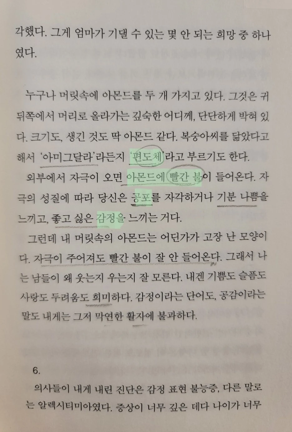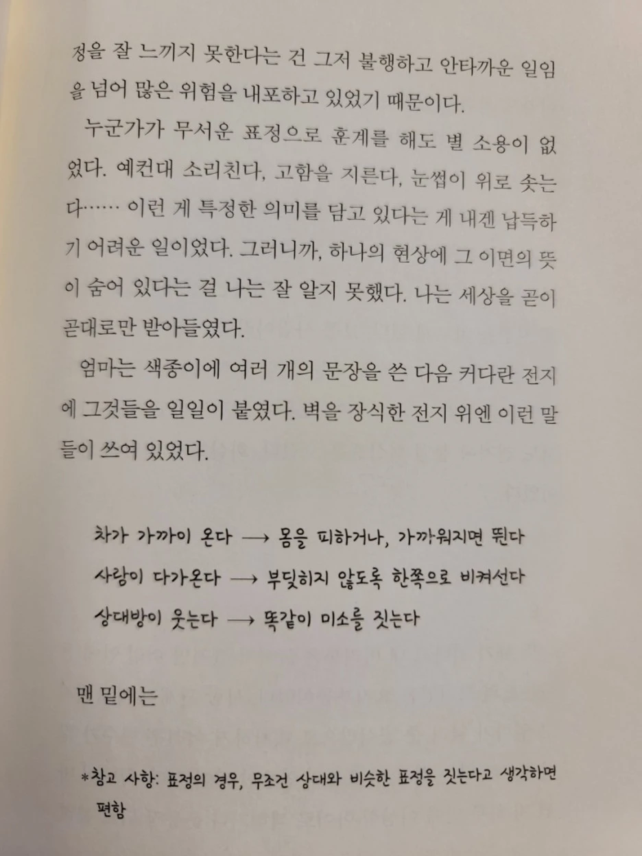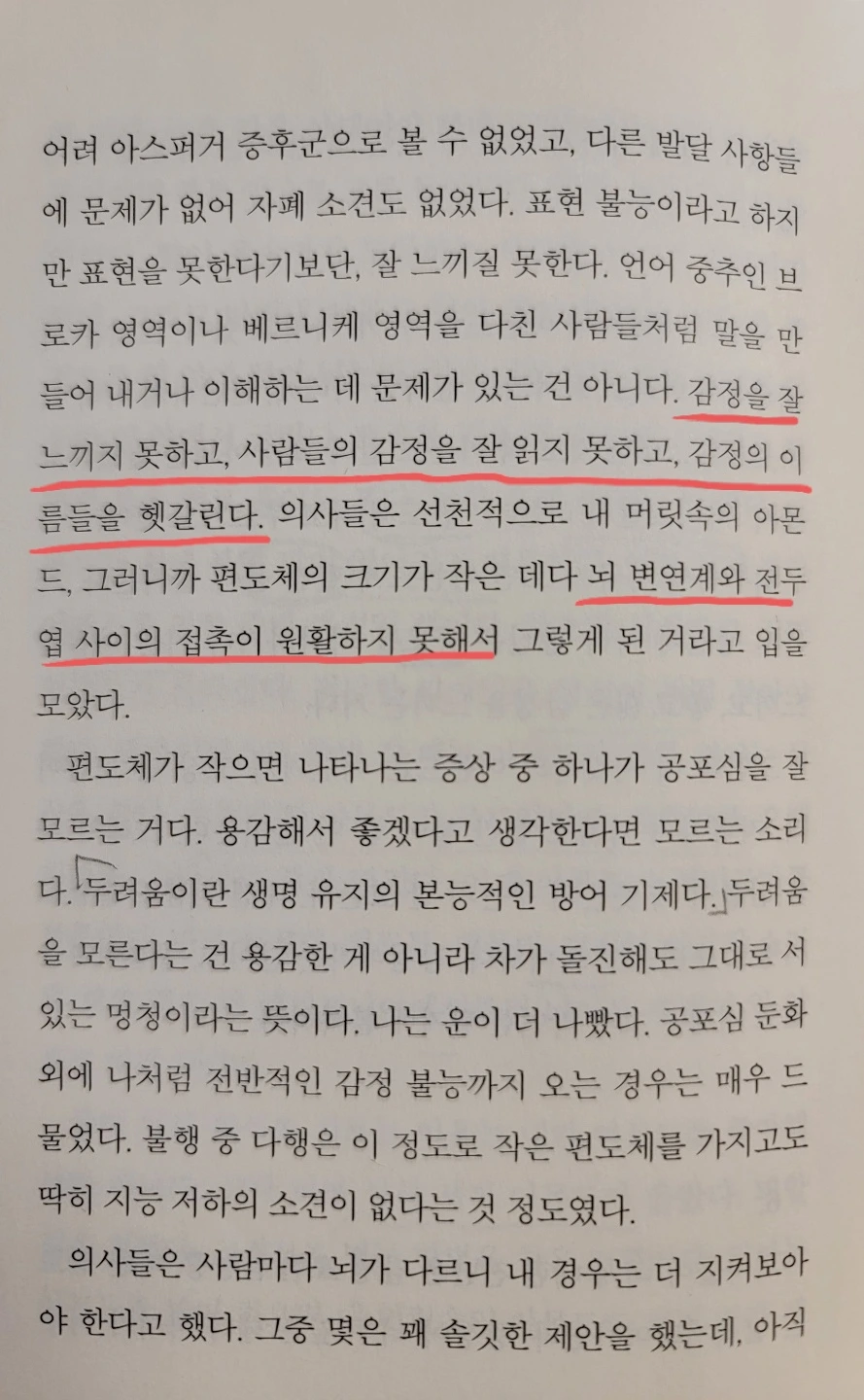 편도체가 작게 태어나지만 노력을 통해 가짜 감정이라도 자꾸자꾸 만들다보면 뇌가 그걸 진짜 감정으로 인식할지도 모른다는 게 심박사의 말이었다. 그러면 편도체의 크기나 활성화에 영향이 있을지도 모른다고. 어쩌면 다른 사람들의 감정을 읽는 게 조금은 쉬워질지도 모른다고.